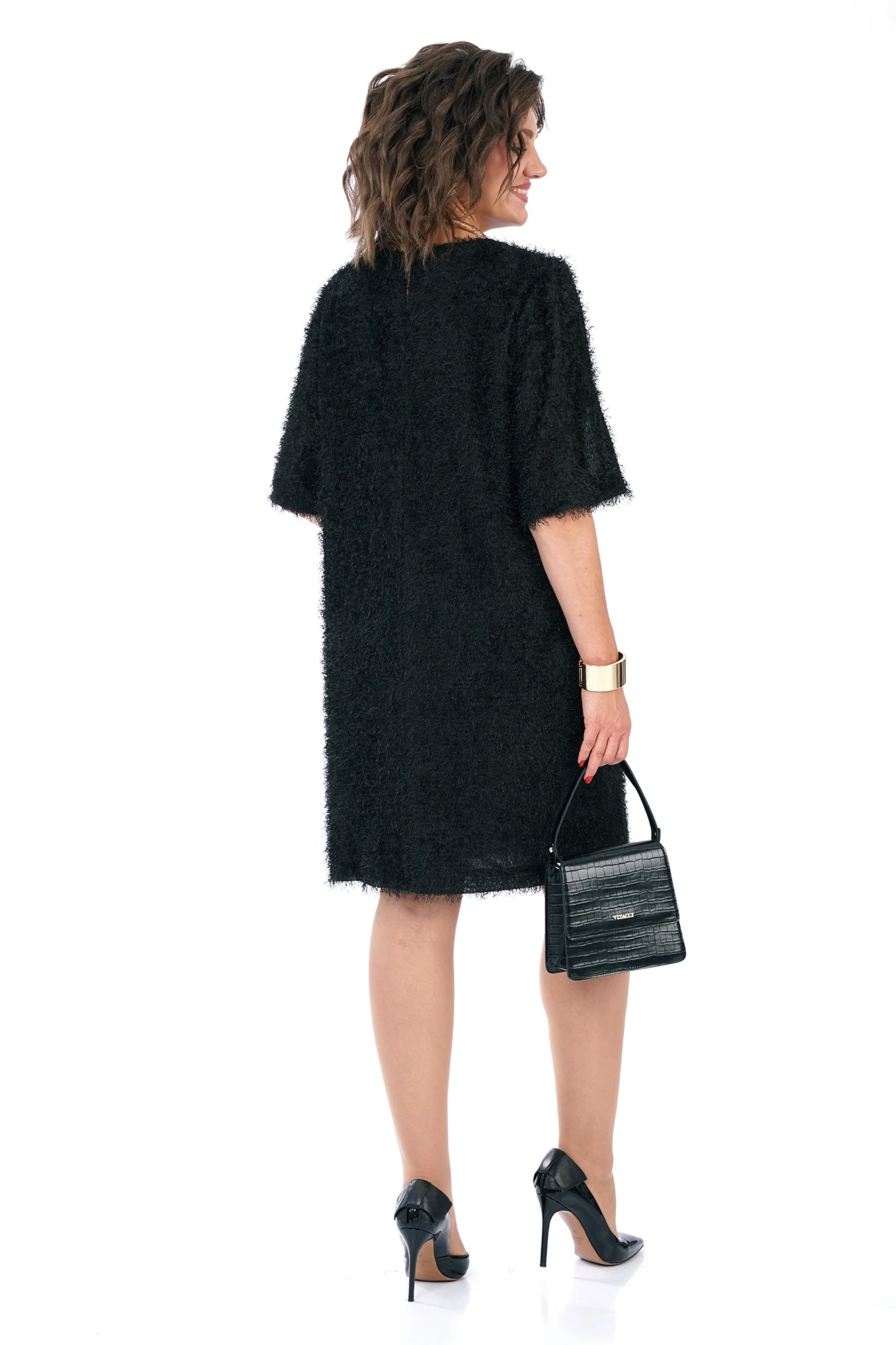 Платье А- образного силуэта, на подкладке. Перед с нагрудными выточками. Спинка со средним швом с разрезом и застёжкой на навесную петлю и пуговицу. Рукава втачные, одношовные, короткие.