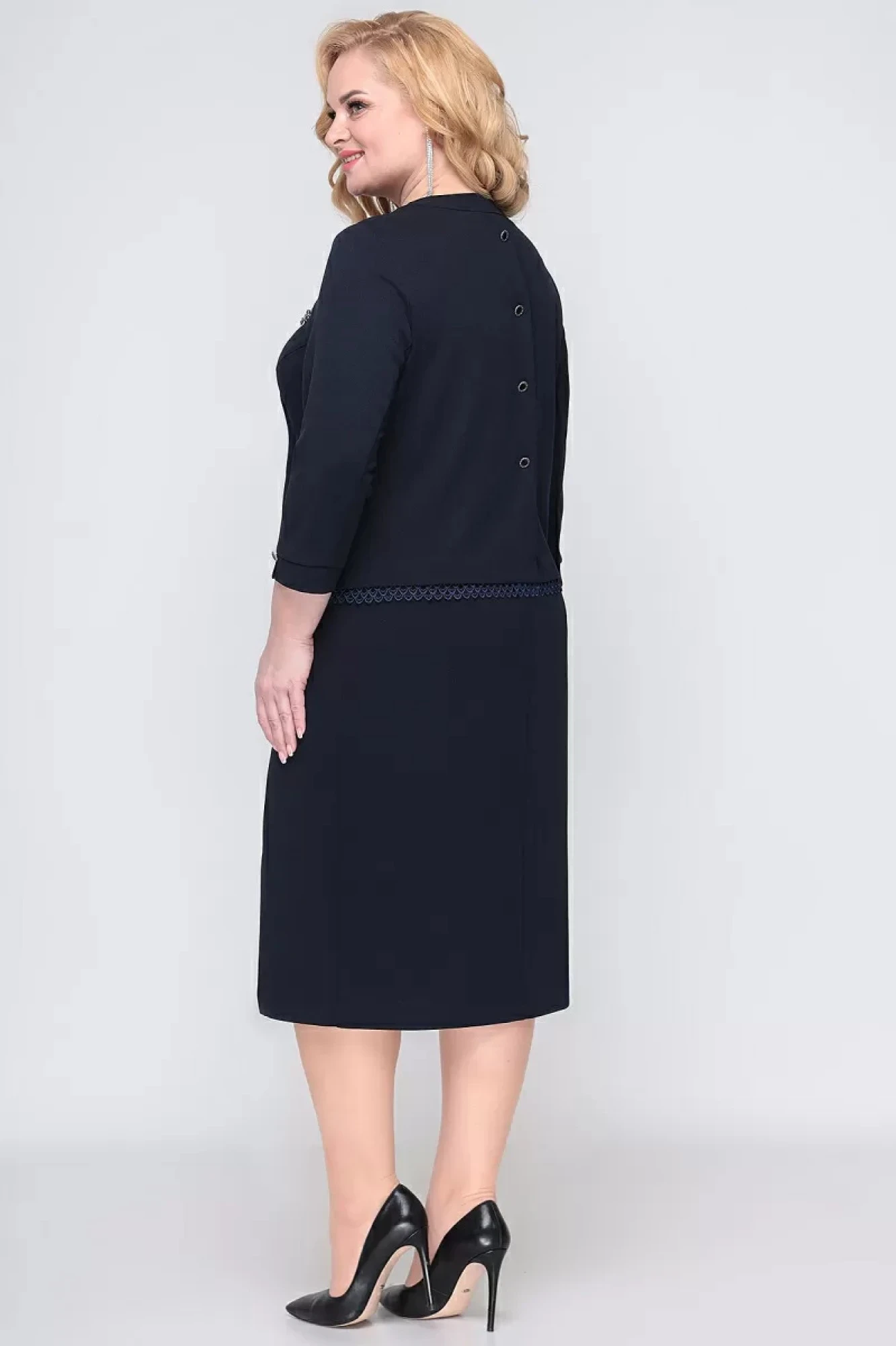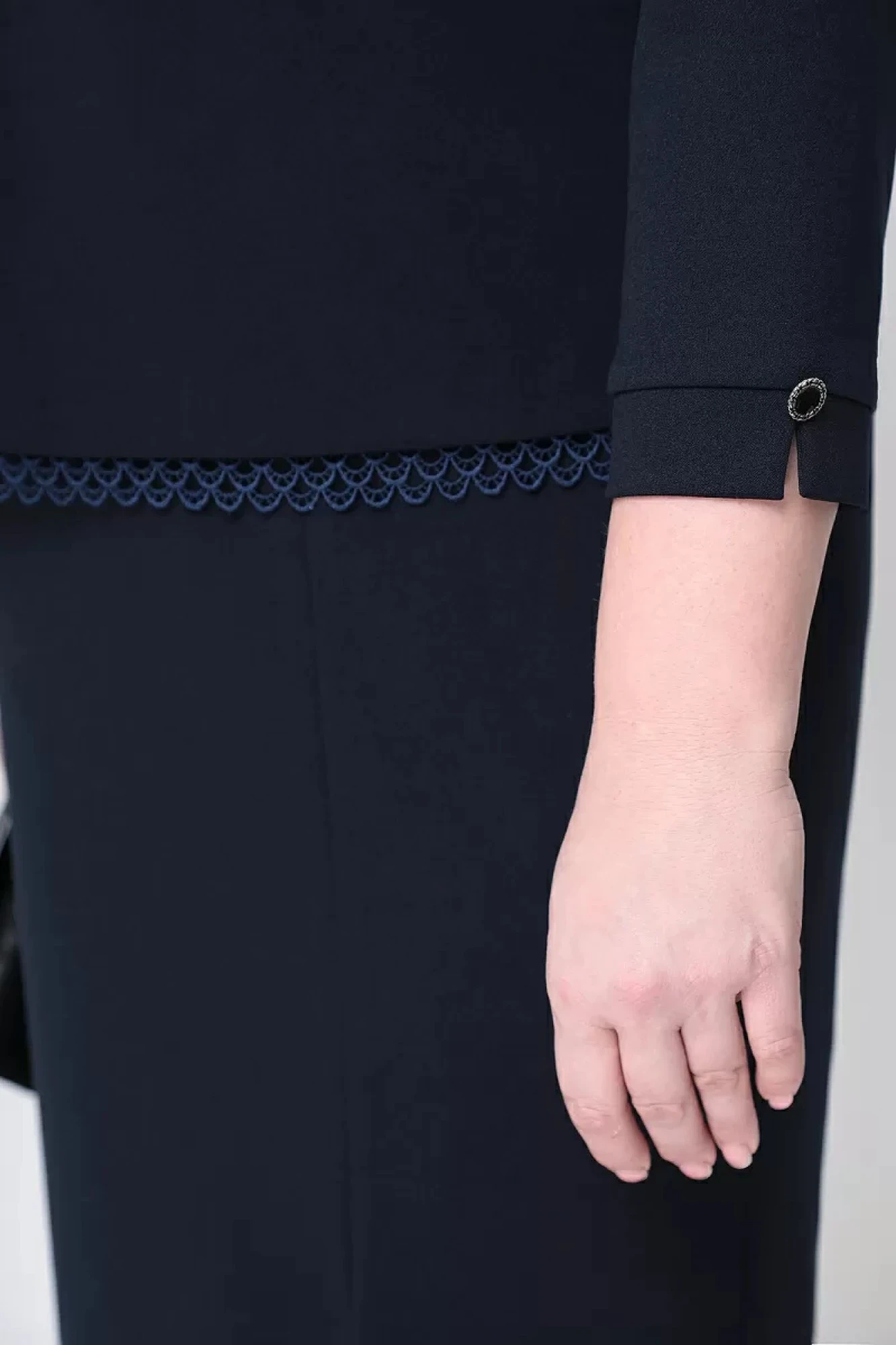 Нарядное женское платье полуприталенного силуэта из трикотажной ткани, универсальное и практичное, длиной ниже колена. Внешне оно смотрится как костюм, потому что верхняя часть спинки и переда отлетные. Платье из такой ткани не сковывает движения, в нём вы будете чувствовать себя комфортно в течении всего дня. По верхней части спинки платья есть имитация застёжки с заходом и пришиты 4 пуговицы, а нижняя с талиевыми вытачками, средним швом. На верхней части переда платья есть нагрудные вытачки, а в нижней в левой по низу - разрез. Вырез горловины фигурный, декорирован съемной брошью. Рукав втачной, двухшовный ¾, по низу есть манжет, который декорирован пуговицей. Верхняя часть платья на трикотажной подкладке. По низу верхней части платья пришито кружево. Комфортная модель на любой случай.