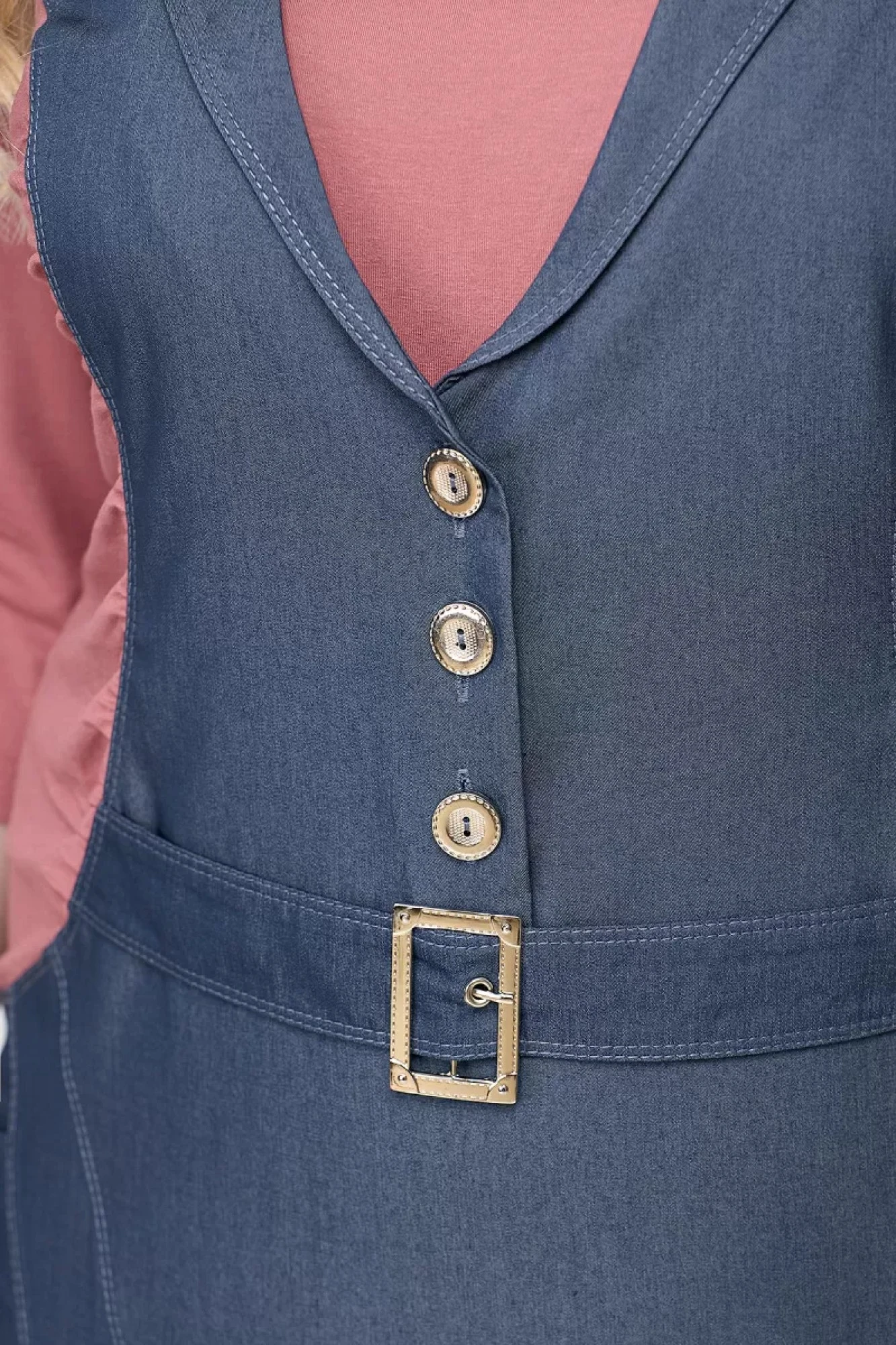 Платье полуприлегающего силуэта в сочетании из двух видов ткани: джинсовой и вискозы, отлично подойдет как в офис, так и на выход. Модель длиной чуть ниже колена. Перед очень красиво разбит на детали и представляет собой имитацию сарафана с нежным отложным воротничком пиджачного типа. По кокеткам отстрочены защипы, по центральной детали - сборка. Чуть ниже талии - декоративный втачной ремень, а также платье с имитацией застежки на 3 металлические пуговки. По переду обработаны удобные и функциональные карманы. Спинка со средним швом и бочками закругленной формы. Рукава втачные, длиной ¾, одношовные. По рукаву внизу заложены 3 небольшие складочки. Материал не тонкий и не толстый, не мнется, скрывает все особенности фигуры.