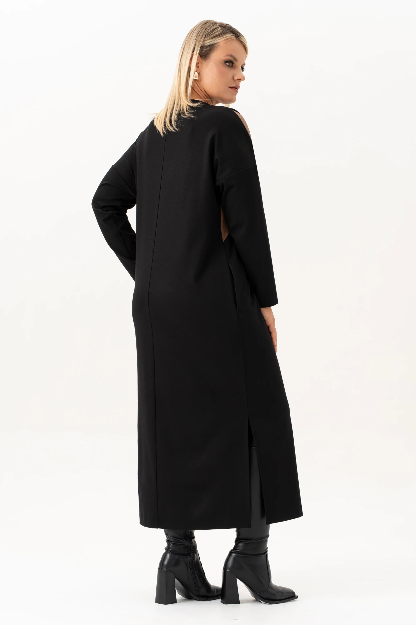 Платье выполненное с имитацией верхнего сарафана. Модель прямого силуэта. Универсальное и практичное изделие из трикотажного полотна «лакоста», премиум качества, очень приятного на ощупь. Длинный крой создает элегантный и утонченный вид, который останется в памяти всех окружающих. Большой размер делает этот сарафан универсальным для разных фигур, что позволяет каждой девушке и женщине чувствовать себя комфортно и уверенно. Этим сезоном безумно актуальными являются наряды со спущенными плечами. Спинка платья со швом. Свободный крой в области талии и бёдер дарит приятное чувство уверенности и комфорта. По переду есть притачные бретели, которые фиксируются с помощью красивой пряжки, а в боковых швах карманы. Вырез горловины в виде небольшой качели. Рукав со спущенной линией плеча, длинный. По низу изделия в боковых швах обработаны разрезы. Не бойтесь экспериментировать! Это платье - сарафан отлично сочетается как с туфлями на каблуке для работы в офисе, так и с яркими аксессуарами для вечерних прогулок или походов по магазинам.