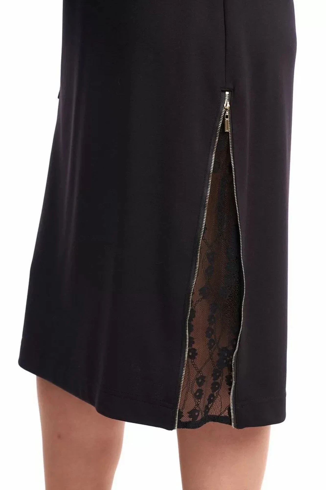 Платье женское, полуприлегающего силуэта, выполнено из трикотажной ткани, используя в качестве декора элементы из кружевной ткани. Вырез горловины овальный, по спинке выполнена капелька и застёжка на воздушную петлю и пуговицу. По переду расположены нагрудные вытачки. Линия плеча спущена, рукав втачной. В качестве декора используется по переду справа накладной карман с пришивным декором, а также в левом боковом шве расположена тесьма-молния и клин из кружевной ткани, который становится видимым при расстёгивании молнии. Платье может быть нарядным, использоваться для работы в офисе, удобное, силуэт скрывает недостатки и подчёркивает достоинства фигуры, за счёт качеств трикотажа, приятное на ощупь и не сковывает движение