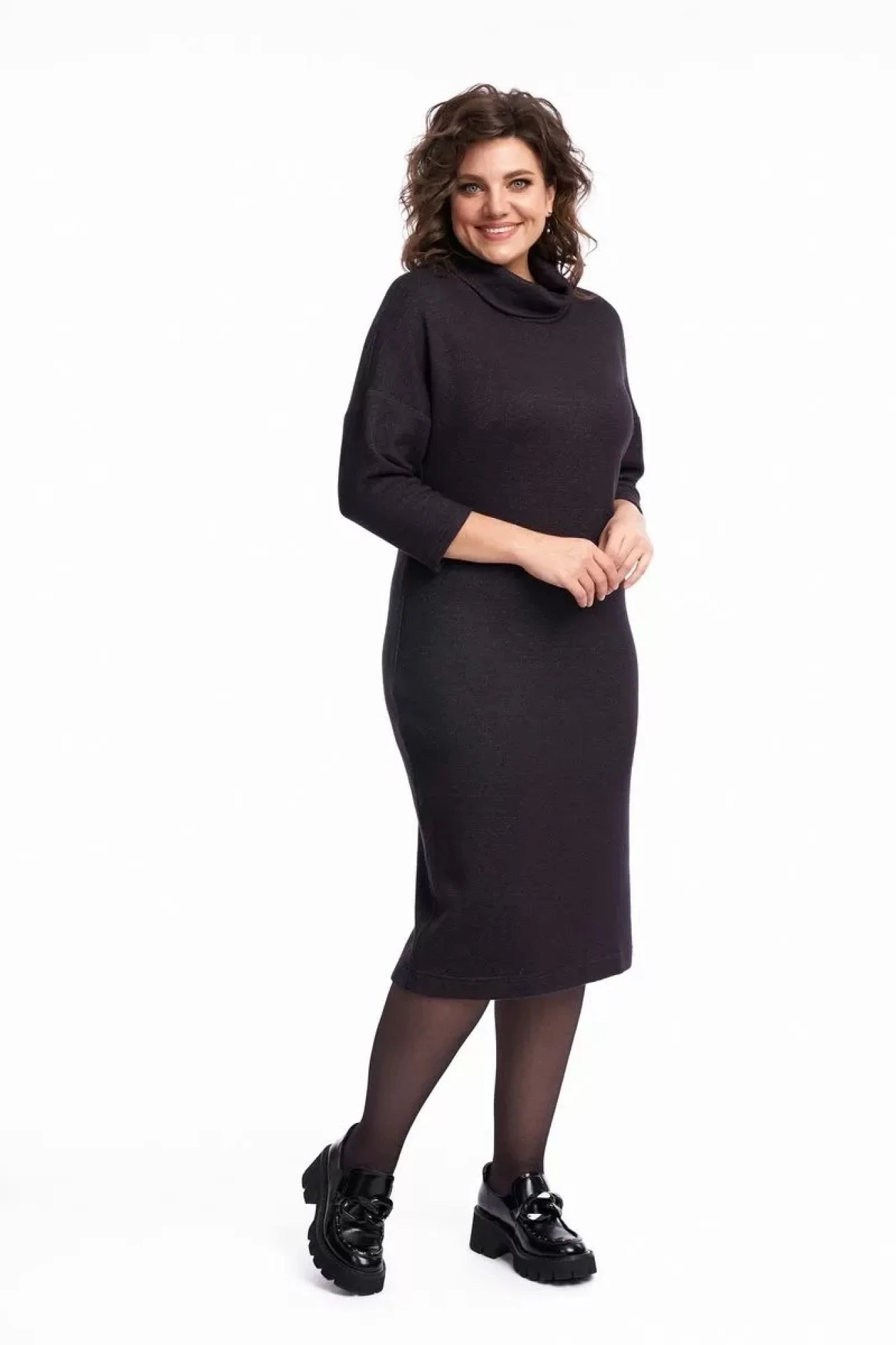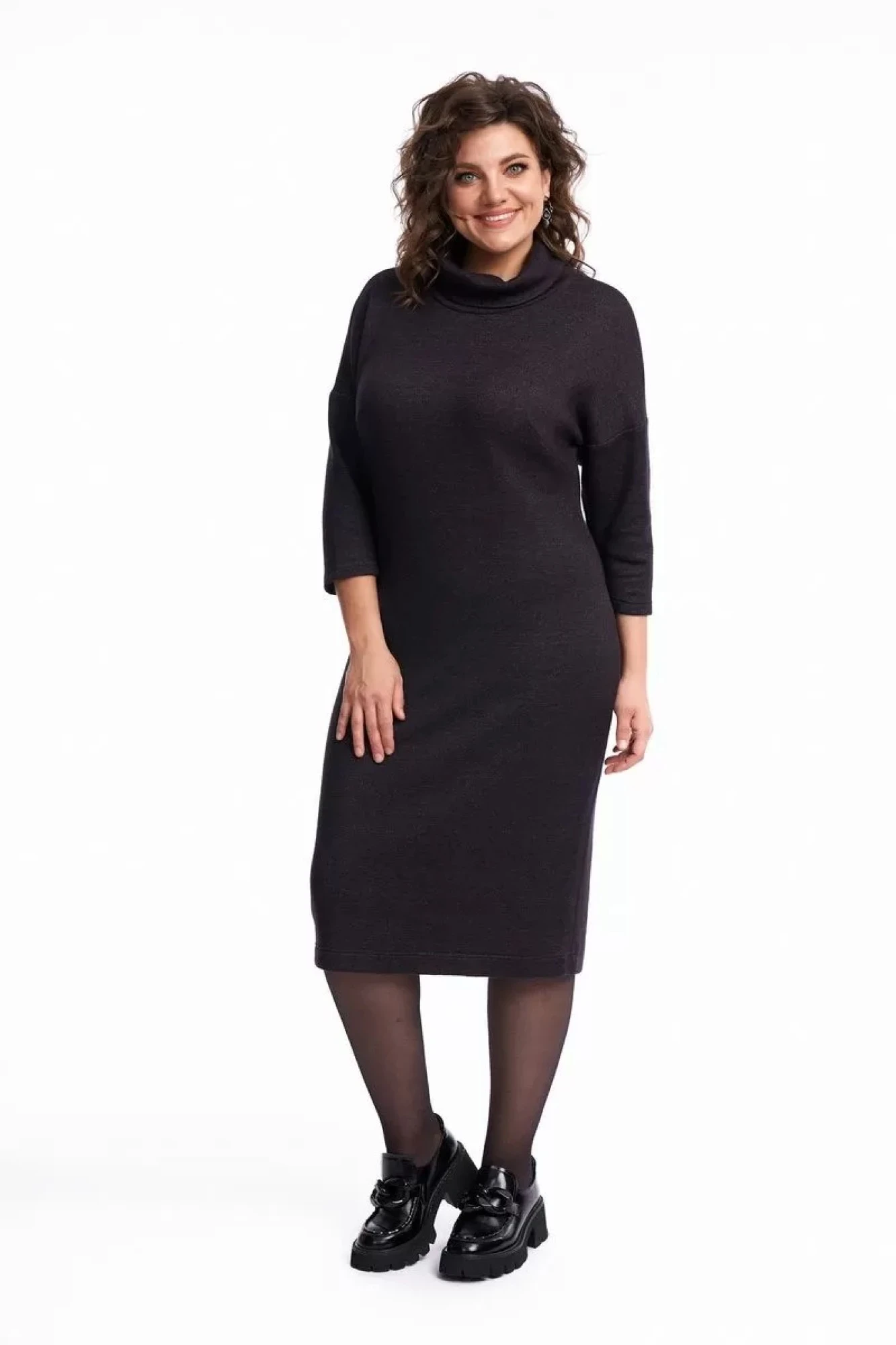 Платье женское, полуприлегающего силуэта, чуть зауженное к низу. По переду расположены нагрудные вытачки. Линия плеча спущена, рукав втачной. Воротник – высокая стойка, которая неплотно прилегает к шее. Платье выполнено из трикотажного полотна, очень мягкое, уютное и приятное. Платье подойдёт для работы и отдыха в холодное время года, при этом сохраняя и подчеркивая женственность.