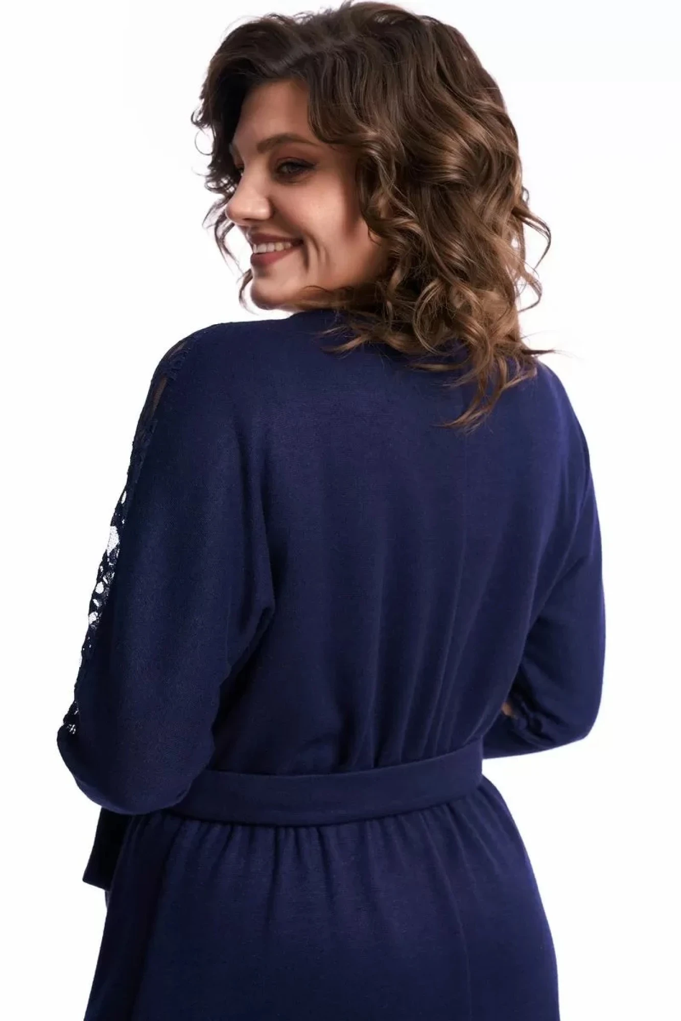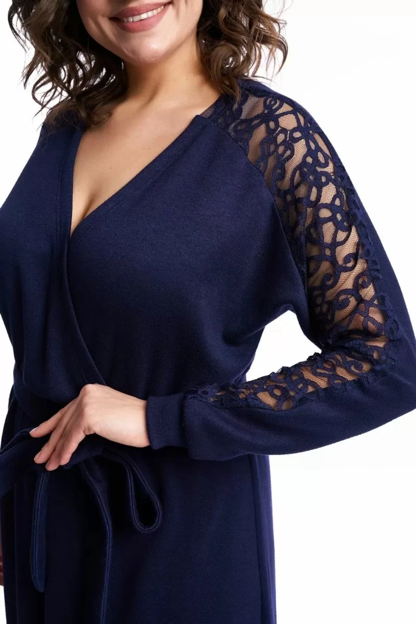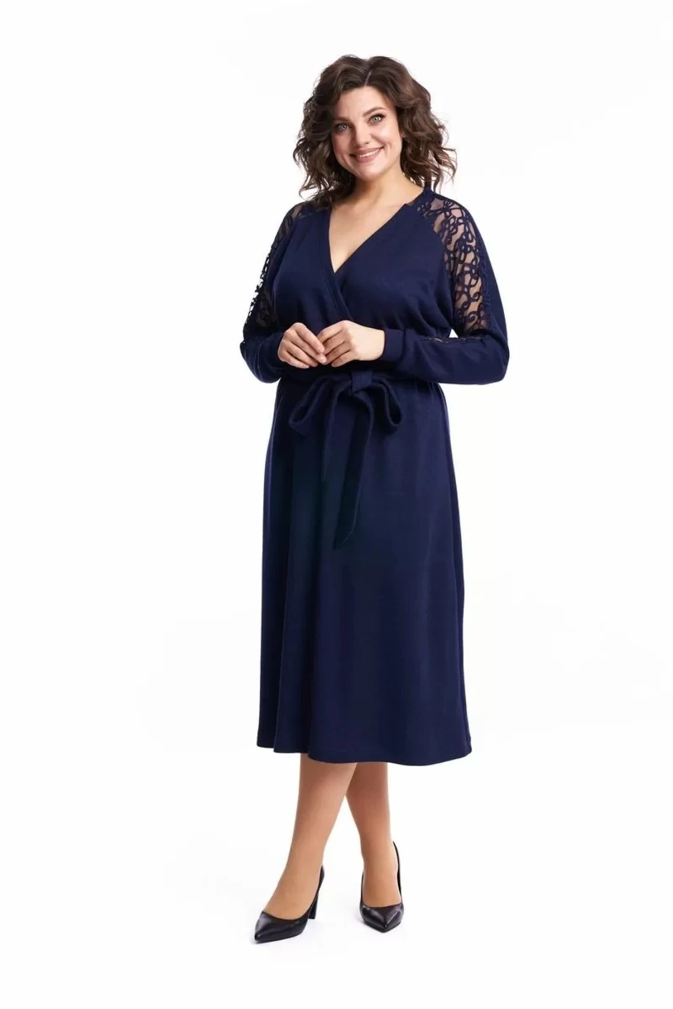 Платье выполнено из трикотажного полотна, мягкое, теплое, расширенное к низу, свободного силуэта. Отрезное по линии талии, по переду запах. Рукав цельнокроеный со вставкой из гипюра,по низу рукава притачной манжет. Линия талии подчеркивается поясом.