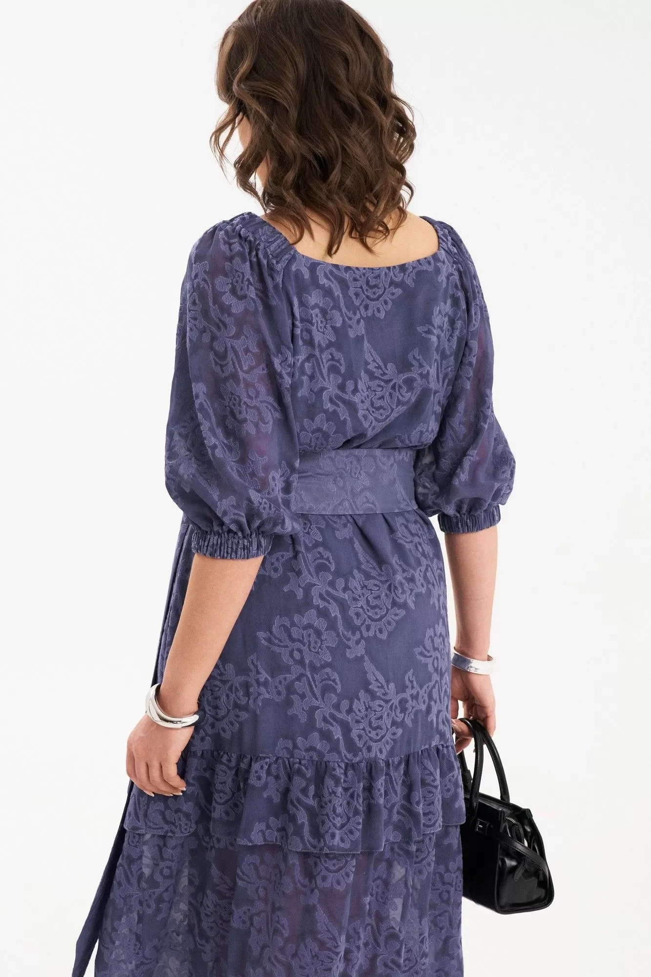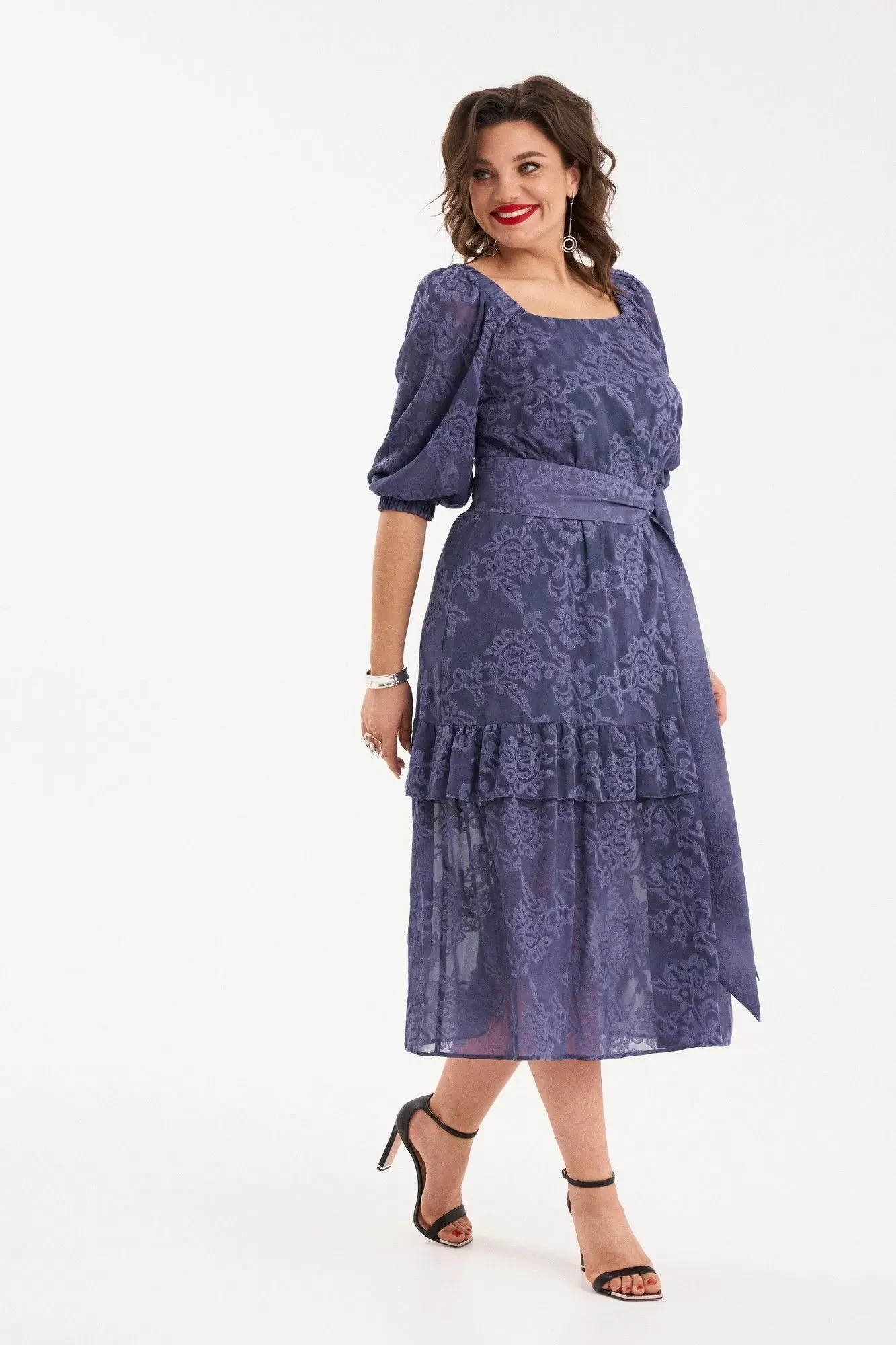 Платье женское полуприлегающего силуэта, расклешенное к низу, на подкладке. В верхней части переда расположены нагрудные вытачки. Нижняя часть платья собрана на сборку. В шов притачивания нижней части вставлен волан, собранный на сборку. Рукав – реглан, верх и низ которого собран на резинку. Вырез горловины прямоугольной формы. В качестве декора используется широкий съемный пояс из основной ткани. Платье очень женственное, удобное, не сковывает движения, может подойти на все случаи в жизни, как для вечерних прогулок по городу, так и для торжеств.