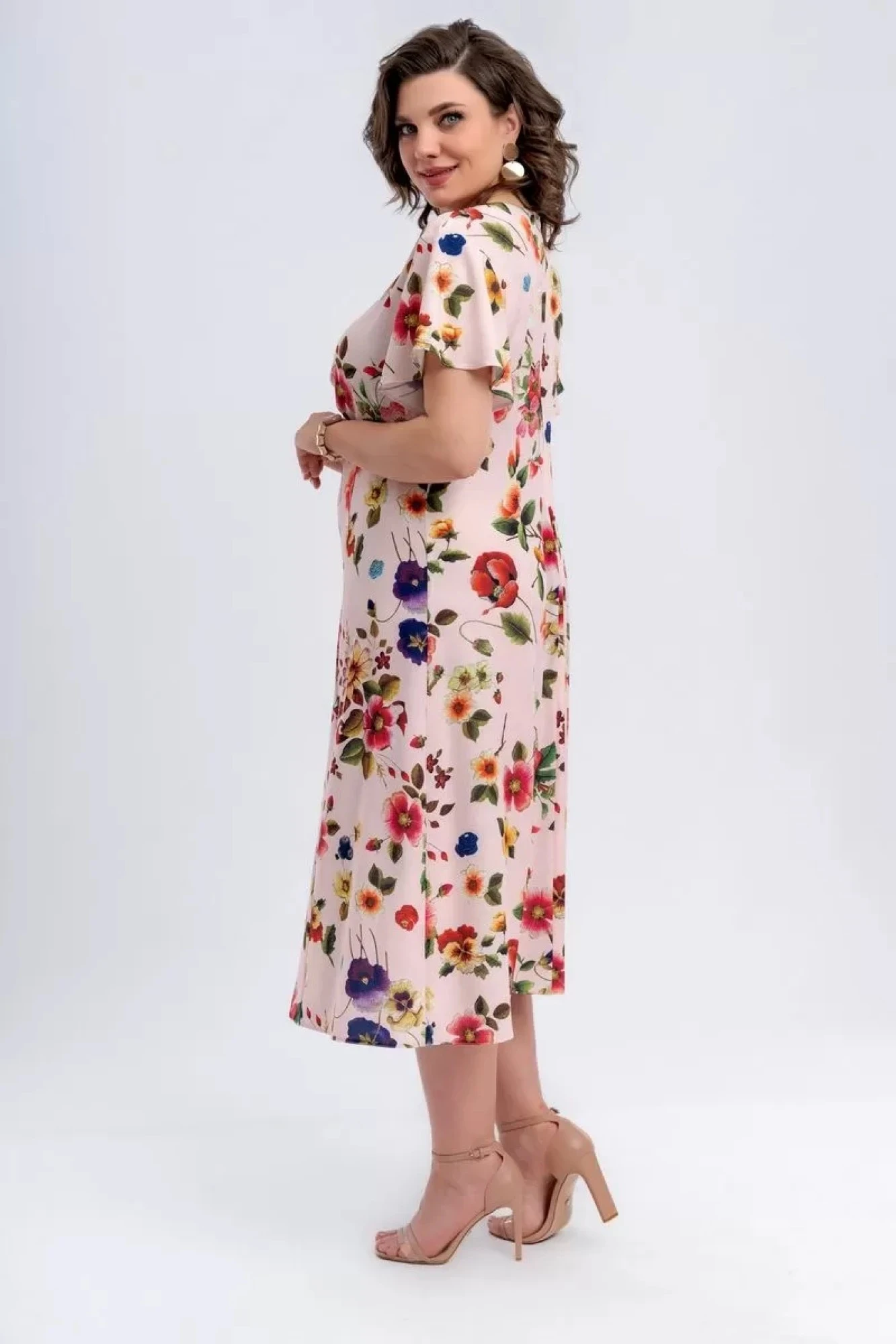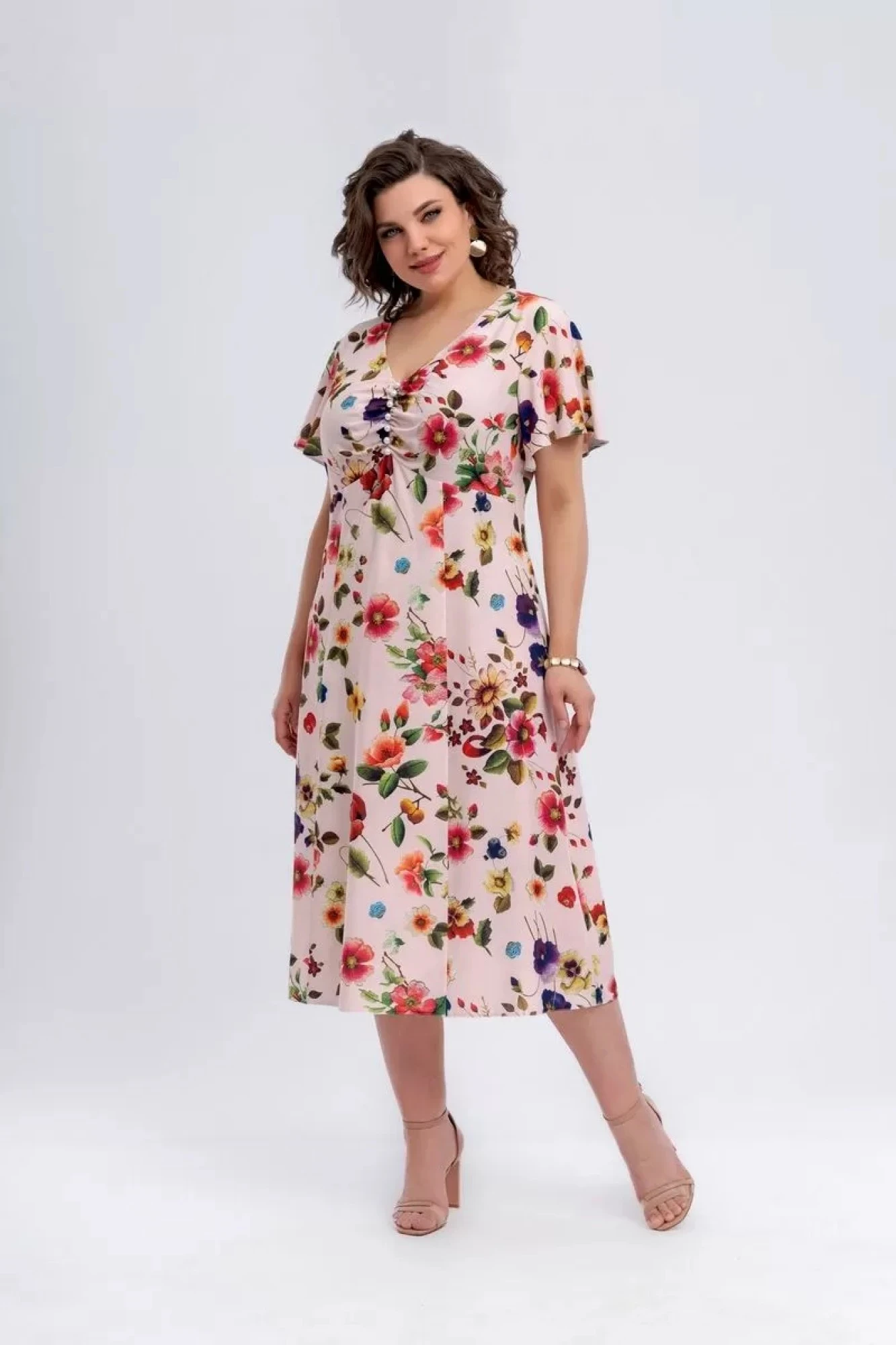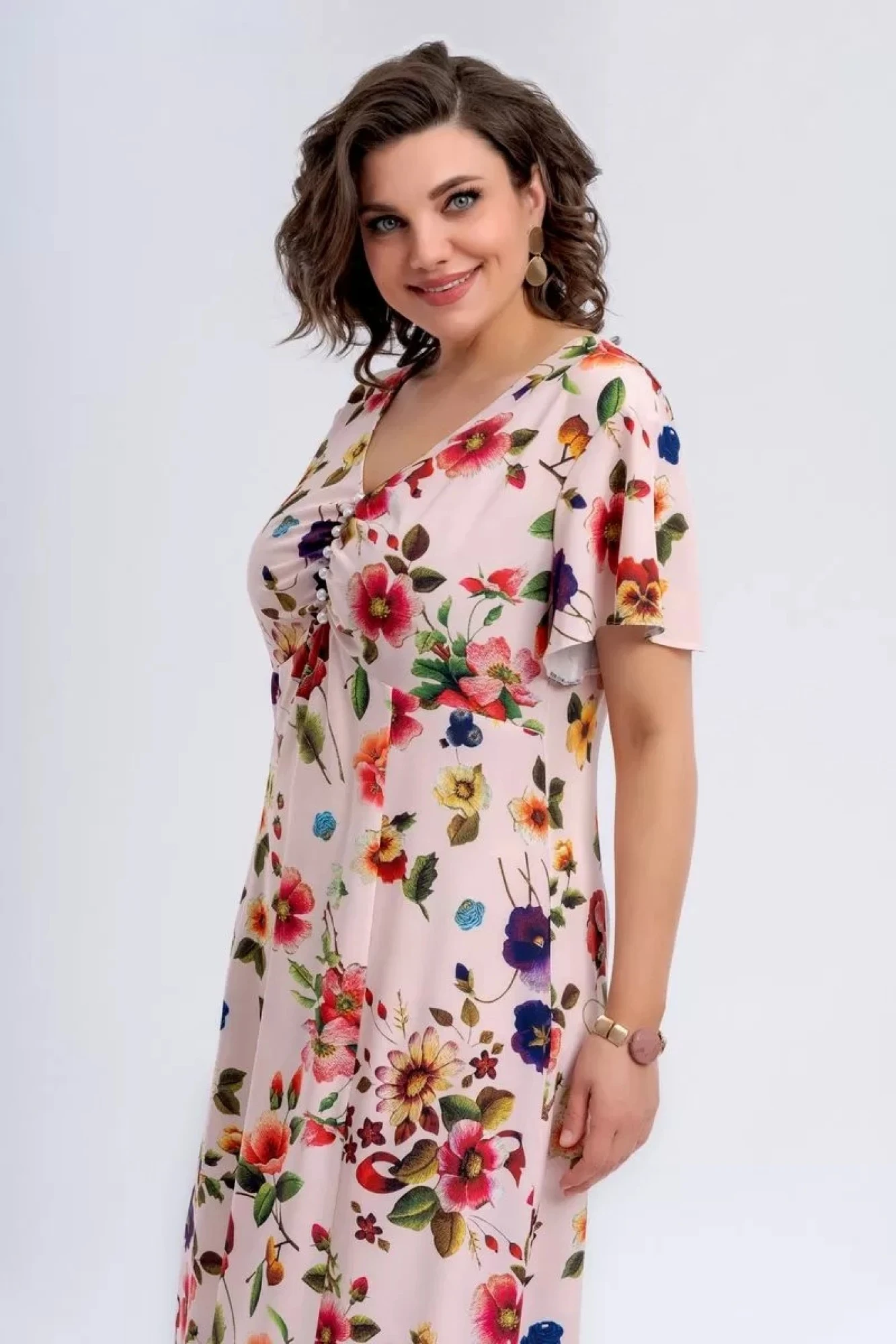 "Платье женское приталенного силуэта, расклешенного к низу. По переду платья выполнены подрезы ниже груди, от подрезов к низу выполнены рельефы. Верхняя отрезная часть переда со средним швом, который задекорирован сборкой и пуговицами. Вырез горловины V-образный. Рукав втачной, короткий, расклешенный. Спинка со средним швом. В среднем шве спинки расположена застежка на потайную тесьму-молнию. Платье очень женственное, удобное, не сковывает движения, может подойти на все случаи в жизни, как для вечерних прогулок по городу, так и для торжеств, и для работы.