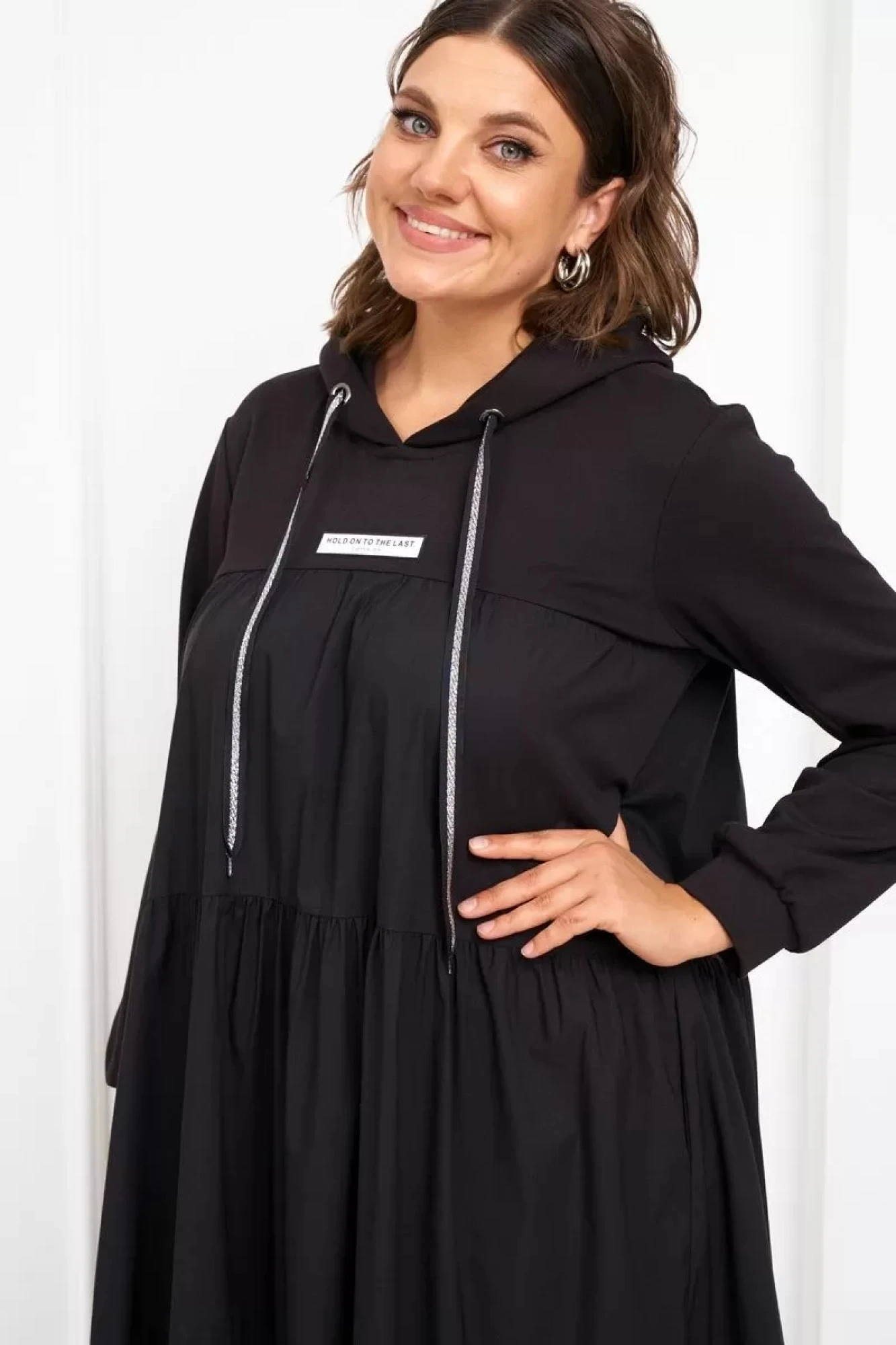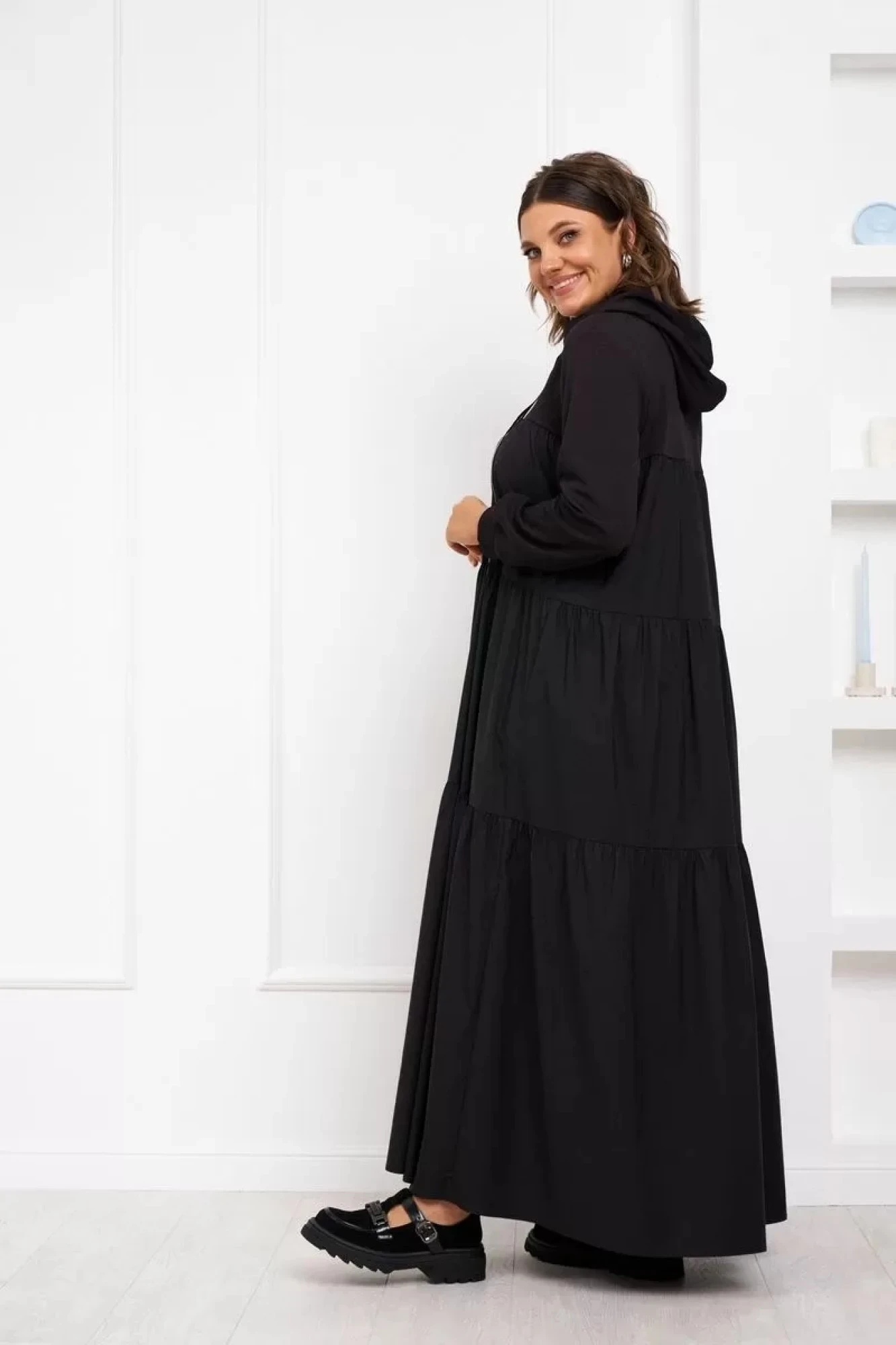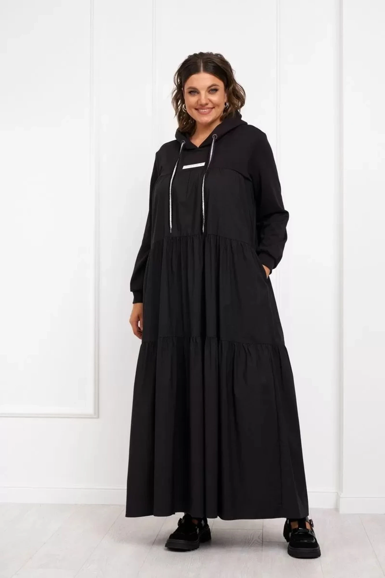 Молодежное платье свободного силуэта, выполнено из двух видов ткани, кокетки, рукава, капюшон - из трикотажа. По переду и спинке три оборки. Рукав втачной, длинный, заканчивается манжетой. Отделкой служат люверсы и шнур.
