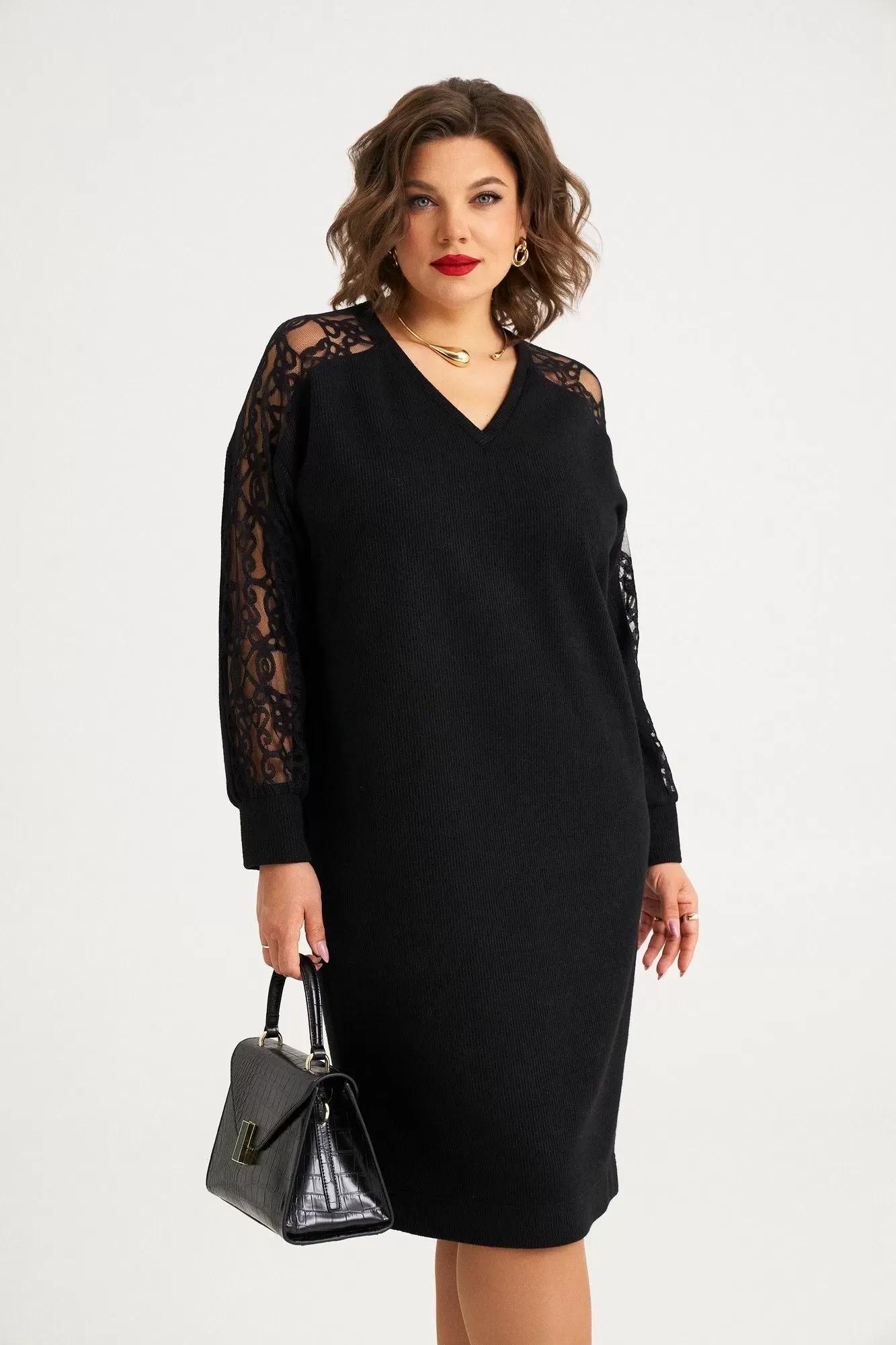 Простое, но стильное платье выполнено из трикотажного полотна со вставками их гипюра.Платье свободного силуэта, слегка заужено к низу, имеют длину миди, ниже колена, что делает его не только удобным, но и элегантным. Рукав длинный со спущенной линией плеча, заканчивается притачной манжетой. Горловина V-образной формы с притачными планками.