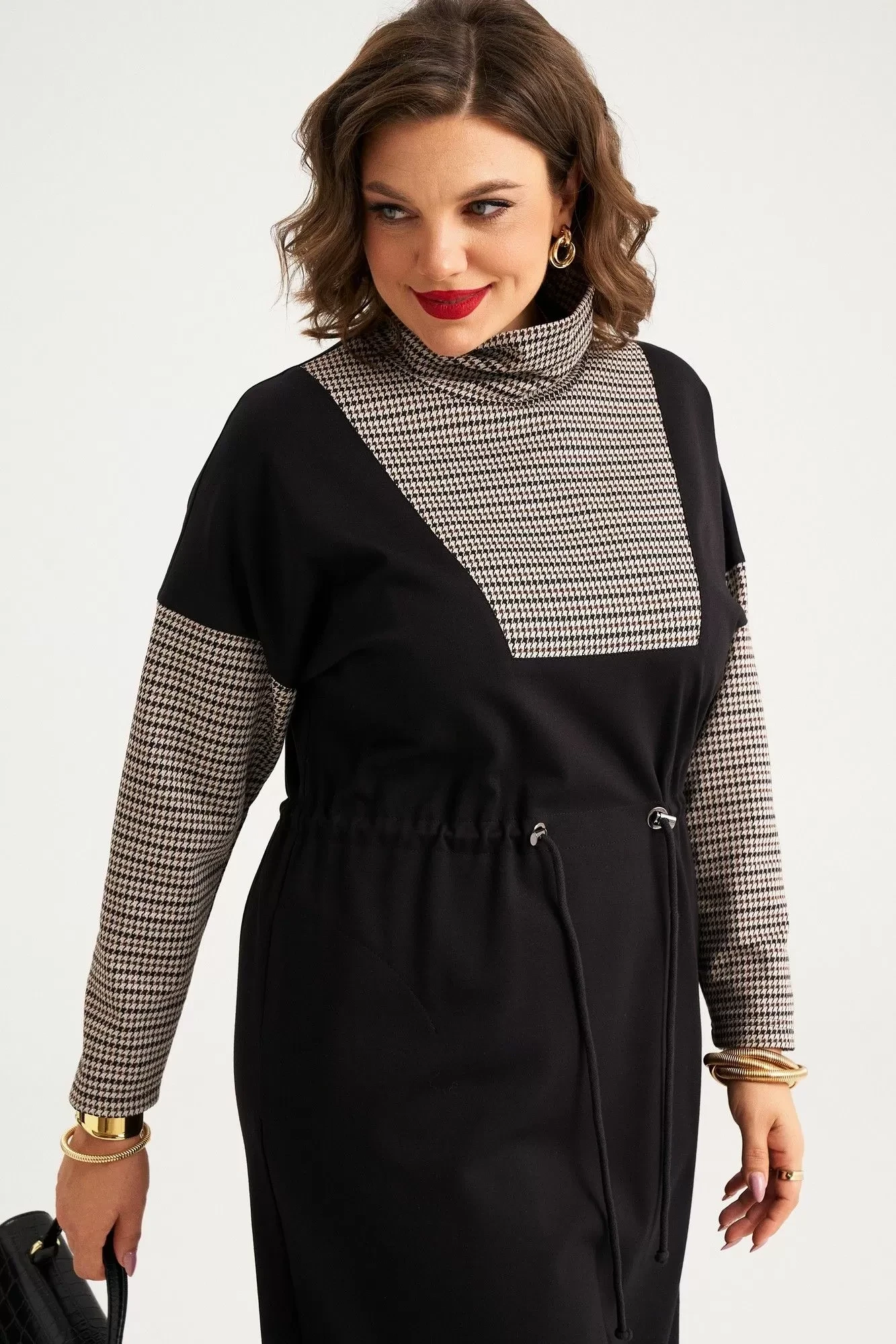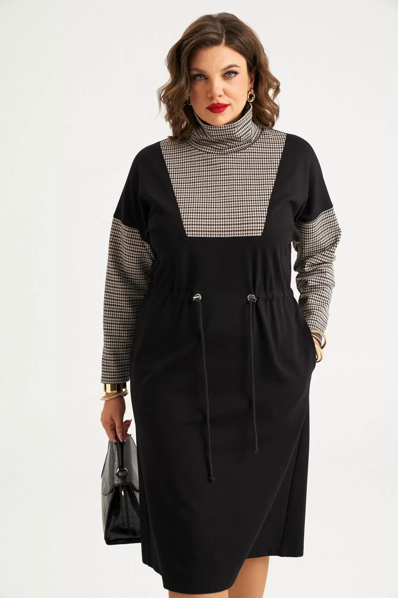 Оригинальное платье выполнено из двух видов ткани, трикотаж и лапка. За счет этого соединения платье напоминает сарафан с водолазкой.По линии талии кулиска со шнуром. В боковых швах внутренние карманы. Платье имеет длину миди, ниже колена, что делает его удобным и идеально подойдет для осенних и зимних дней.