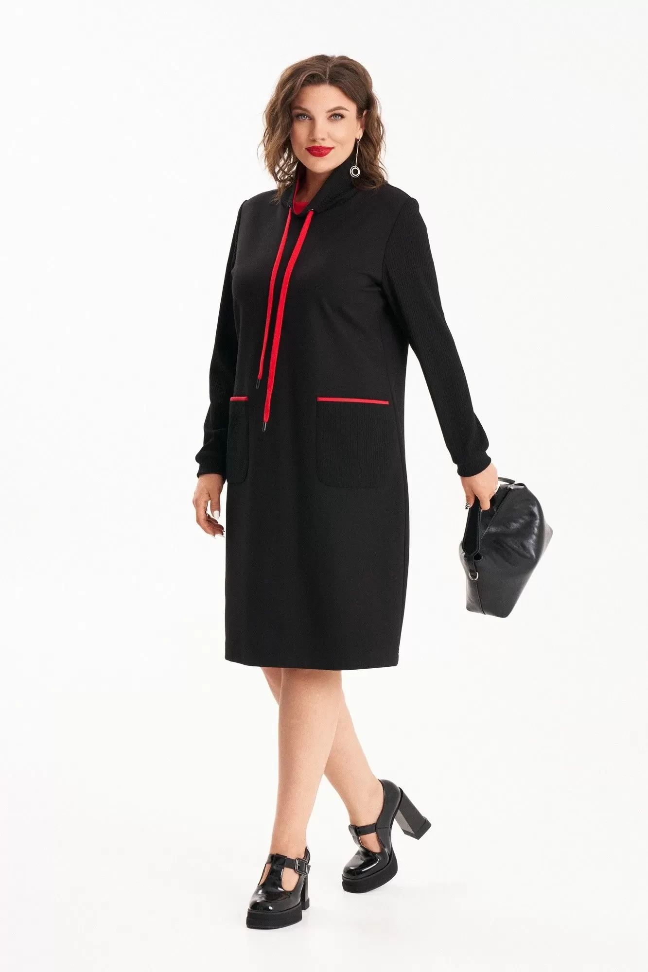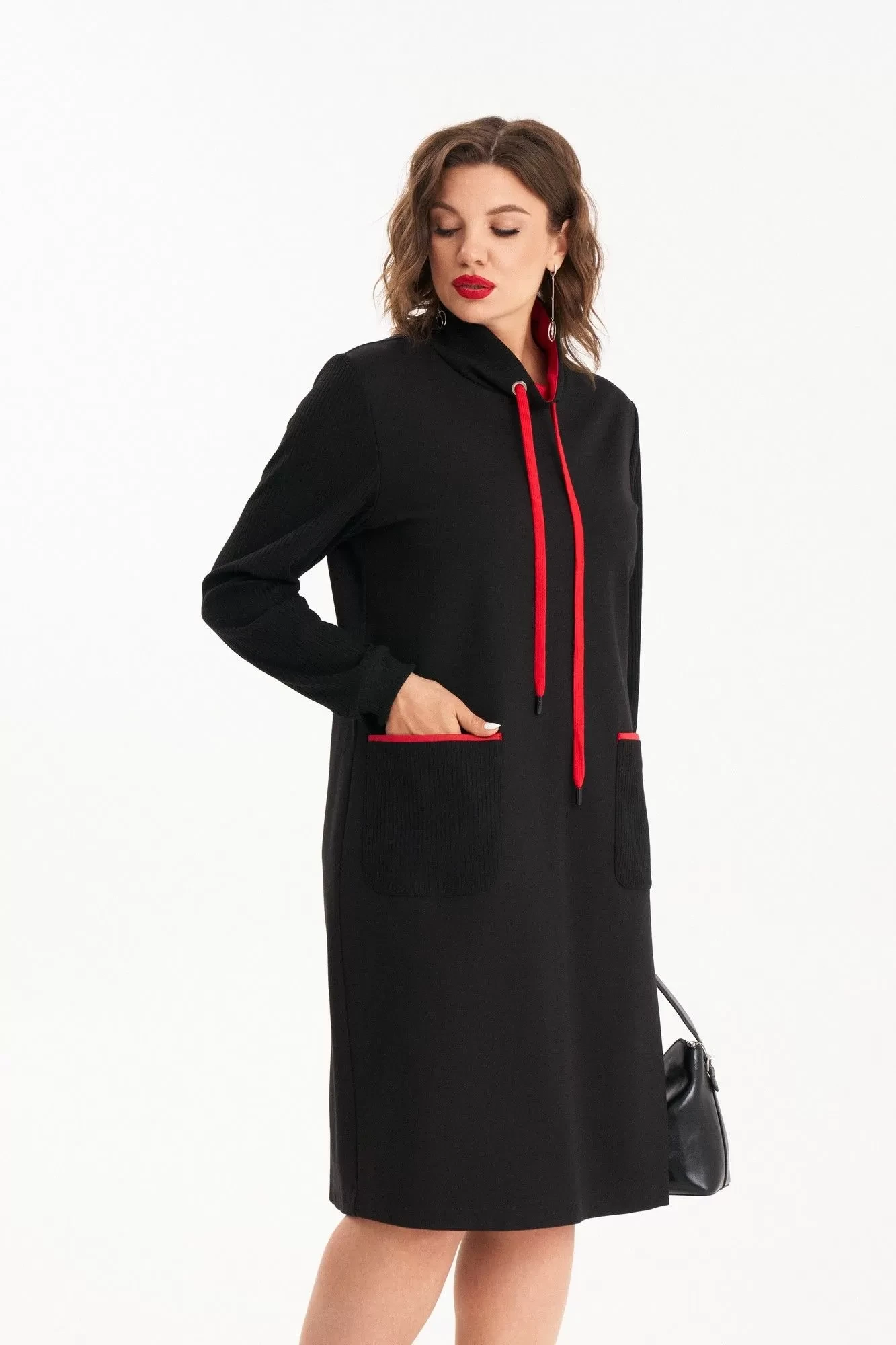 Когда комфорт и добротность выходят на первый план, платье из трикотажного полотна должно быть в каждом гардеробе. Платье полуприлегающего силуэта имеет длину миди, выполнено из двух видов ткани: полочка и спинка из трикотажа, рукава, карманы и стойка из лапши трикотажной. По переду накладные карманы. Отделкой служит трикотаж яркого цвета по карманам, внутренняя стойка, а также шнур и люверсы на стойке.В таком платье вы будете выглядеть безупречно в любой ситуации.