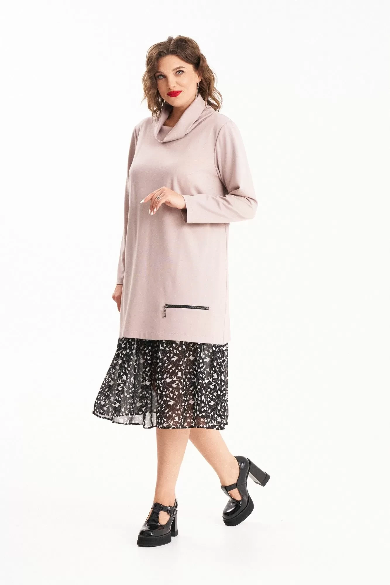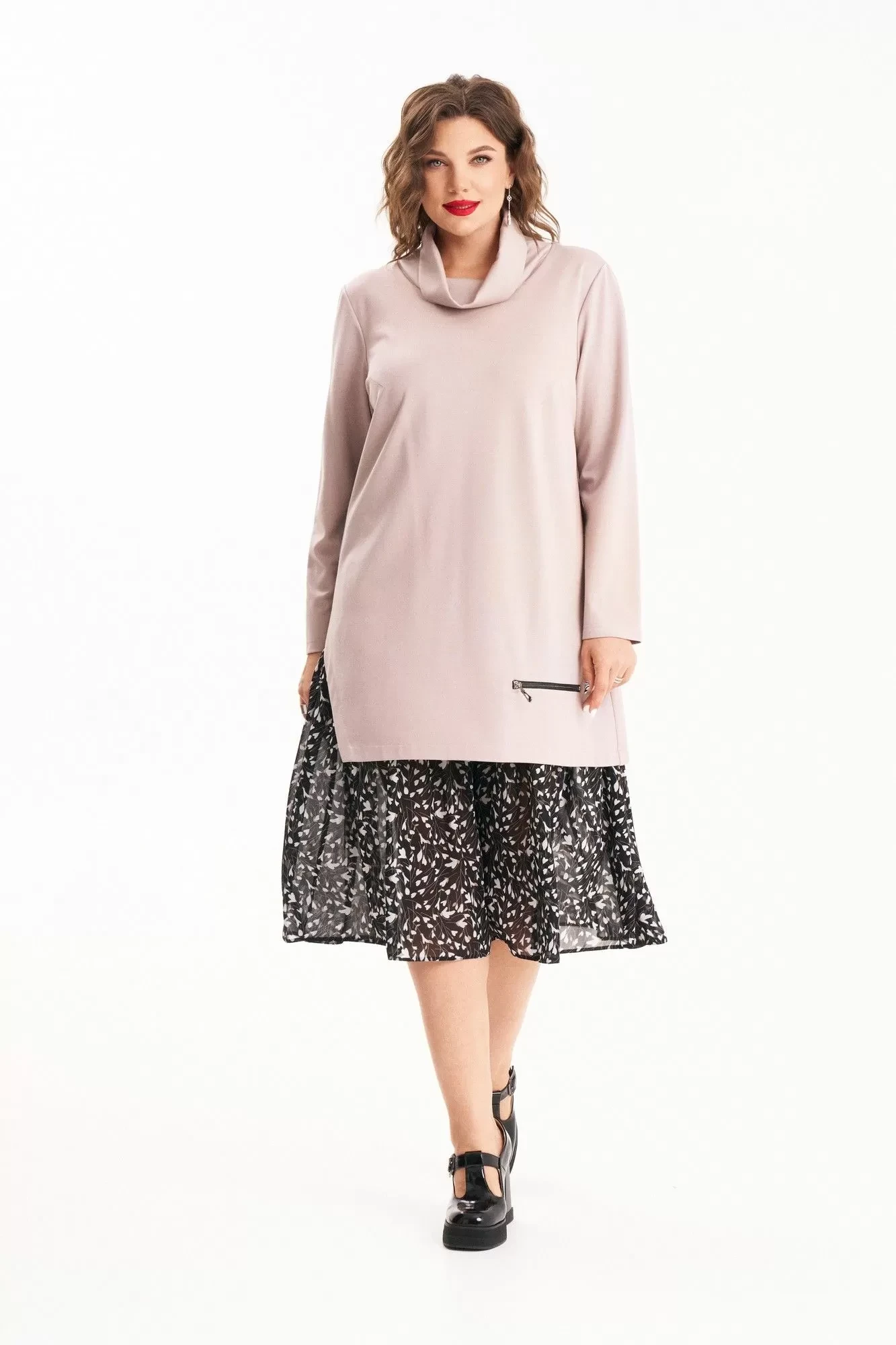 Оригинальное, эффектное платье на подкладке, выполнено из трикотажного полотна и шифона. Платье прямого силуэта с оборкой по низу. На полочке внизу - декоративная молния. Рукав втачной, длинный. Воротник - стойка отложная. Платье имеет лоину миди , ниже колена, что делает его не только удобным, но и элегантным. Зрительно платье создает эффект платья с удлиненным джемпером.