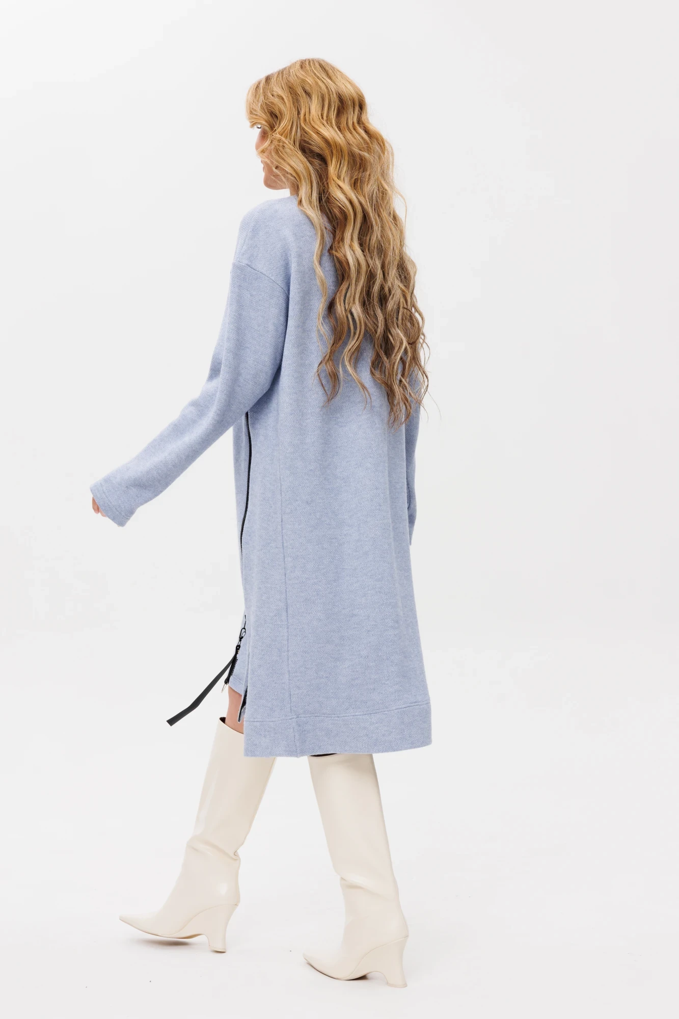 платье-туника прямого силуэта со спущенным плечом.Вырез горловины круглый.В рельефе декоративная молния.По переду накладной карман с декоративной нашивкой.