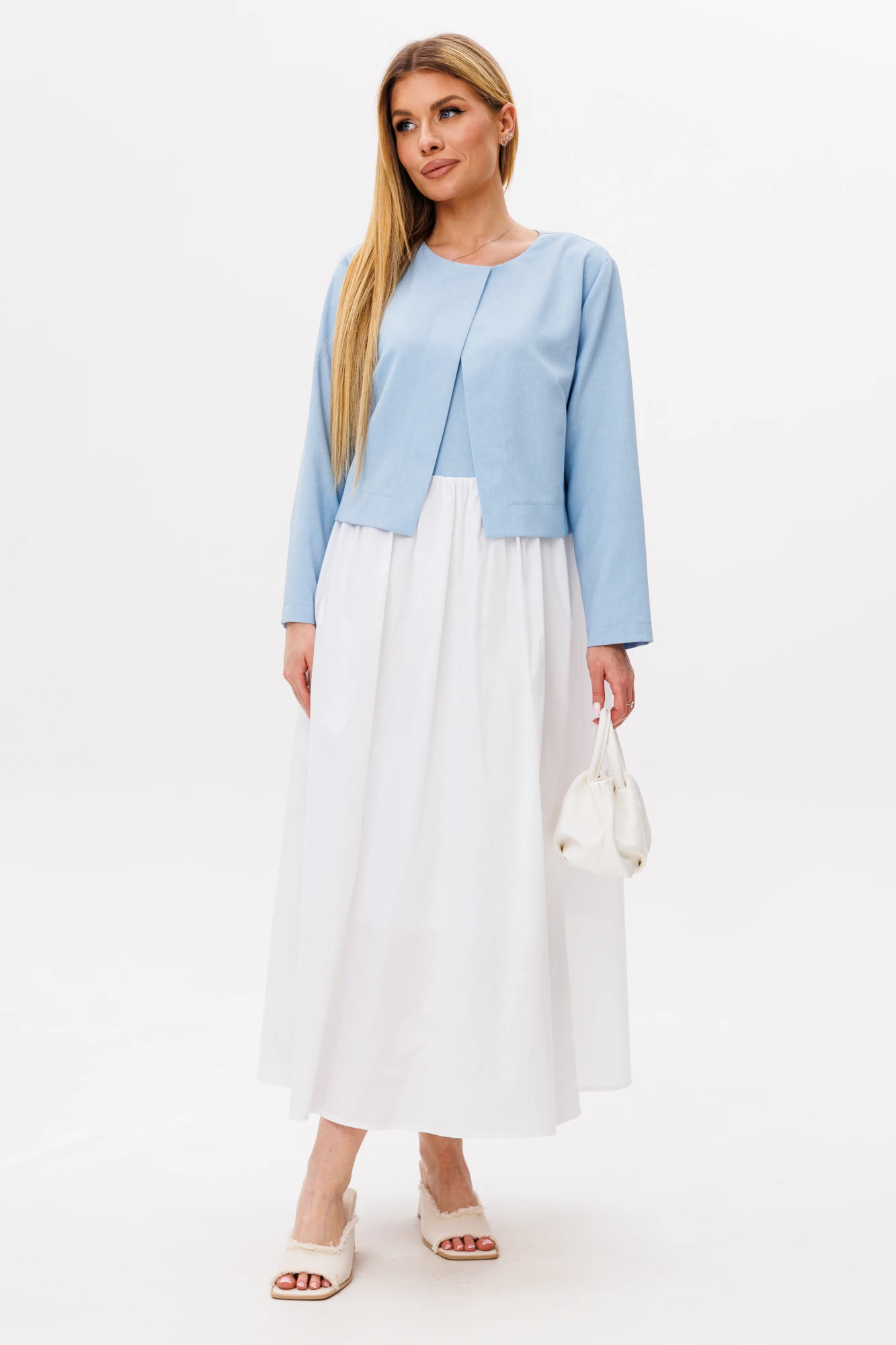 Платье женское свободного силуэта с имитацией накидки. Платье отрезное по линии талии. Верхний лиф на запах по переду и нагрудной вытачкой. Вырез горловины круглый по спинке застежка на потайную молнию. Юбка на сборке по талии.