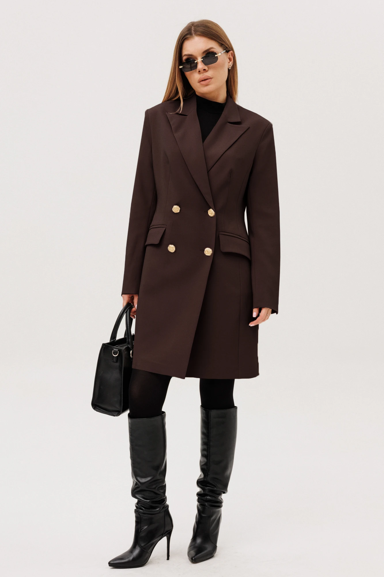 Платье-пиджак прилегающего силуэта,выполнен из теплой ткани.Застежка на петли-пуговицы,по переду действующие карманы,на рукавах шлицы.Изделие на подкладке