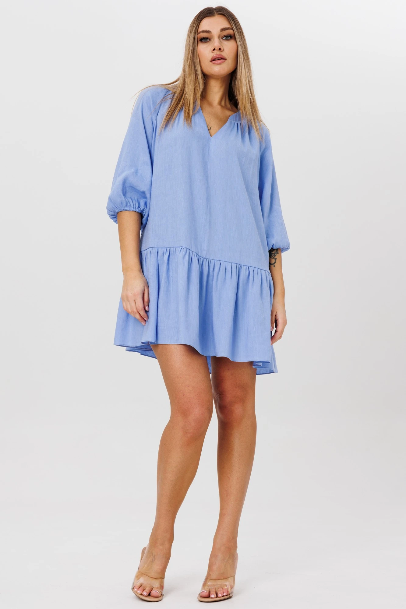 Горловина со сборкой, обработана притачной стойкой. Перед со средним швом, спинка цельная. Рукав реглан 3/4, снизу собран на резинку. Низ платья обработан воланом со сборкой.