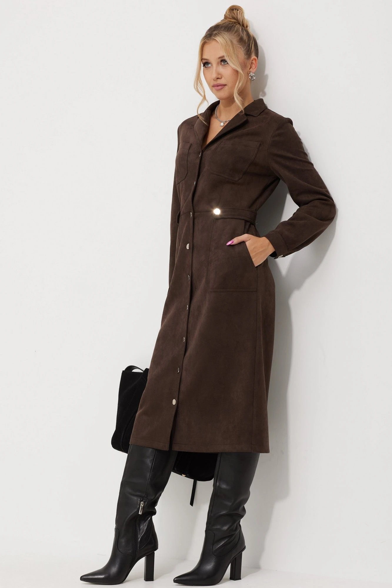 Платье женское полуприлегающего силуэта слегка зауженное к низу. Платье представлено из двух видов ткани из джинса на хлопковой основе и благородного замша. Застежка центральная на петли и пуговицы, воротник пиджачного типа. Платье отрезное по линии талии. На лифе полочки настрочены фигурные накладные карманы, на лифе и юбке обработаны талевые выточки, по юбке обработаны боковые накладные карманы. По спинке лифа обработана кокетка, также обработаны талевые выточки для более идеальной посадки. По линии талии по бокам паты, застёгивающиеся на петли и пуговицы. Рукава длинные втачные по низу притачная манжета на петлю и пуговицу