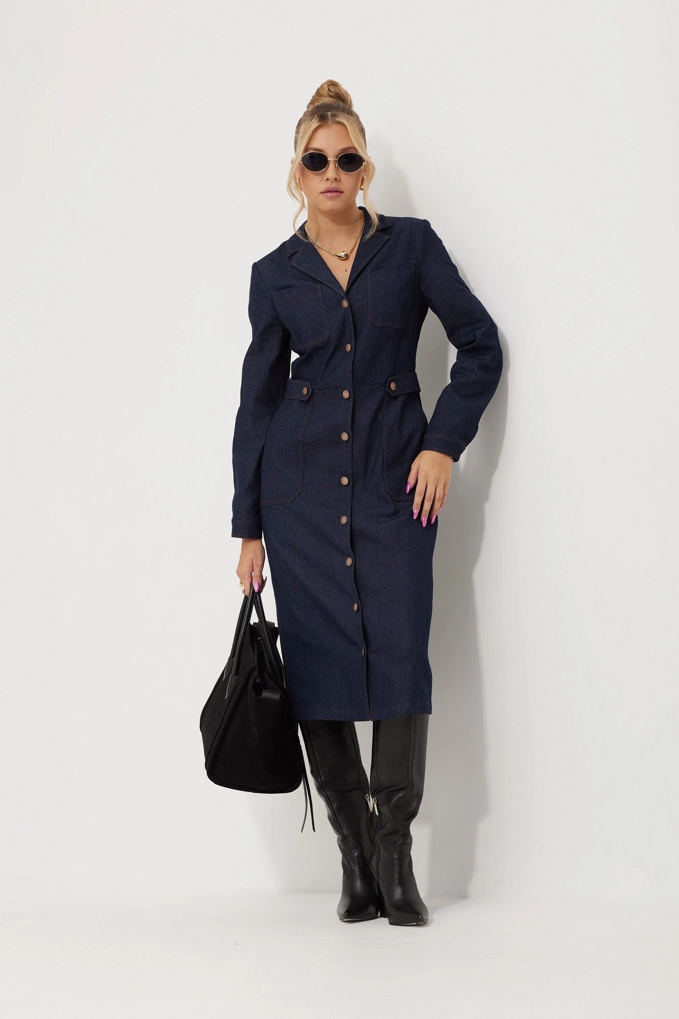 Платье женское полуприлегающего силуэта слегка зауженное к низу. Платье представлено из двух видов ткани из джинса на хлопковой основе и благородного замша. Застежка центральная на петли и пуговицы, воротник пиджачного типа. Платье отрезное по линии талии. На лифе полочки настрочены фигурные накладные карманы, на лифе и юбке обработаны талевые выточки, по юбке обработаны боковые накладные карманы. По спинке лифа обработана кокетка, также обработаны талевые выточки для более идеальной посадки. По линии талии по бокам паты, застёгивающиеся на петли и пуговицы. Рукава длинные втачные по низу притачная манжета на петлю и пуговицу