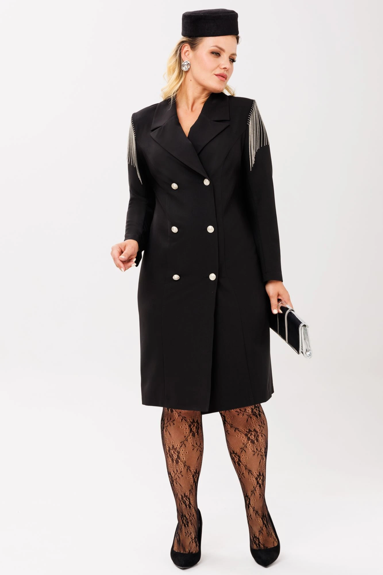 Платье женское из текстильной ткани двубортное, полуприлегающего силуэта. По полочке и спинке прилегание создается за счет рельефов, выходящих из проймы. По спинке - средний шов, переходящий в шлицу. Вороник пиджачного типа. Застежка на петли и пуговицы. Рукав втачной двухшовный со шлицей и пуговицами. По окату рукова отделка в виде металлезированной бахромы. Длина по спинке: (50-54)-104 см, (56-58)-107см. Длина рукава: (50-54)-60см, (56-58) 62 см.