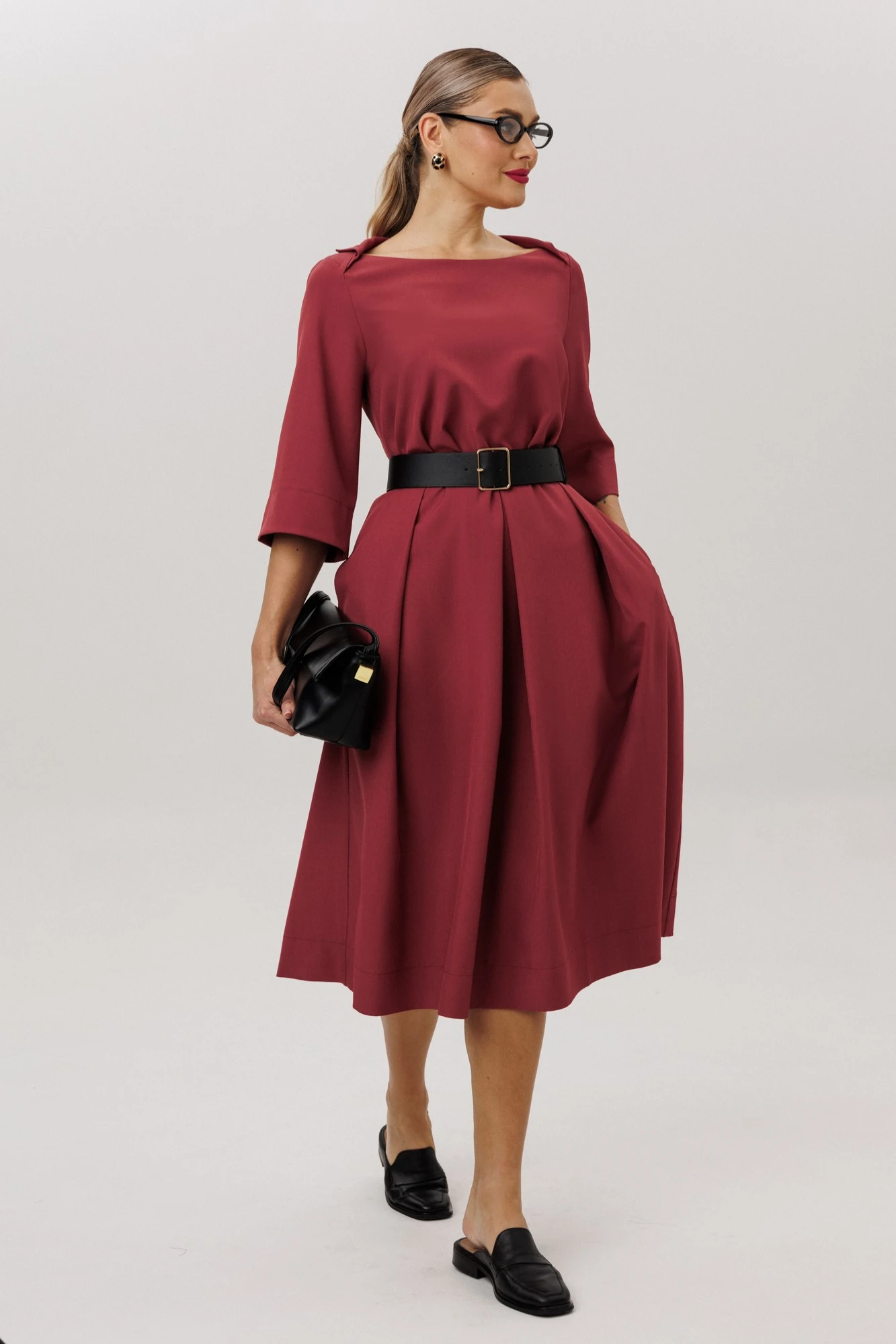 Шикарное платье с поясом ремнем. Отличный вариант универсального изделия: подойдет как для повседневного и офисного гардероба, так и для праздничного выхода. Отрезное по линии талии. По полочке объем груди создается за счет направленных складок из подреза. Объем юбки создается за счет центральной встречной и 2-х односторонних складок. По бокам в юбке- карманы. Рукав втачной, 3/4 длинны с отворотом. Вырез горловины лодочка с отложным воротником. В комплекте съемный пояс.