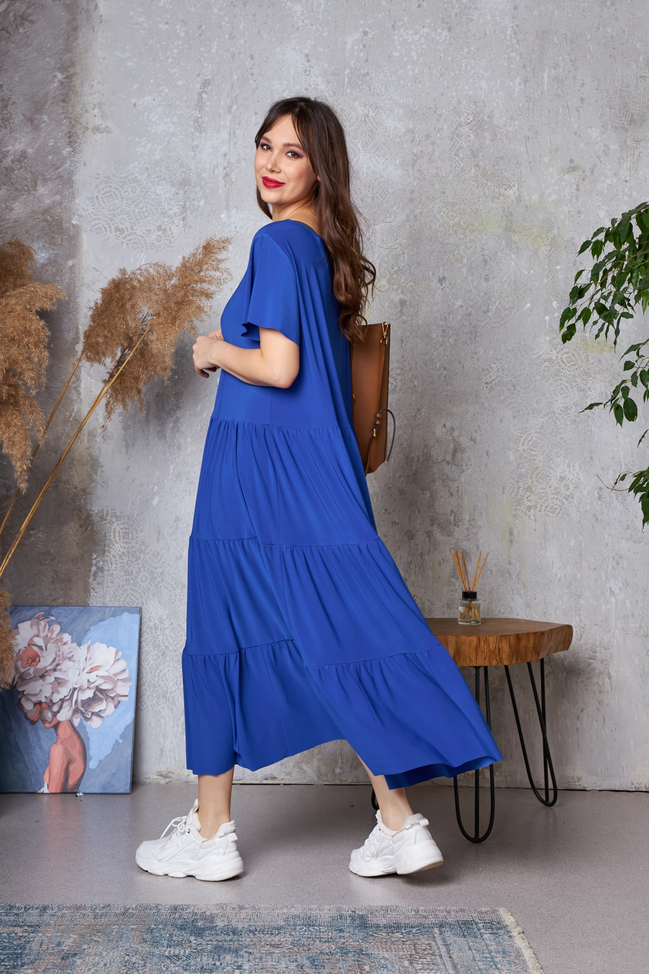 Платье женское трапециевидного силуэта из трикотажного полотна "масло"- идеальный вариант для повседневного образа. Будет отлично смотреться с босоножками, кроссовками или балетками. Отрезное по линии талии, с 3-мя воланами. Рукав короткий, расширенный к низу. Легкую непринужденность модели придают необработанные низ платья и рукава. Благодаря своему крою сядет на любую фиуру и скроет все недостатки.