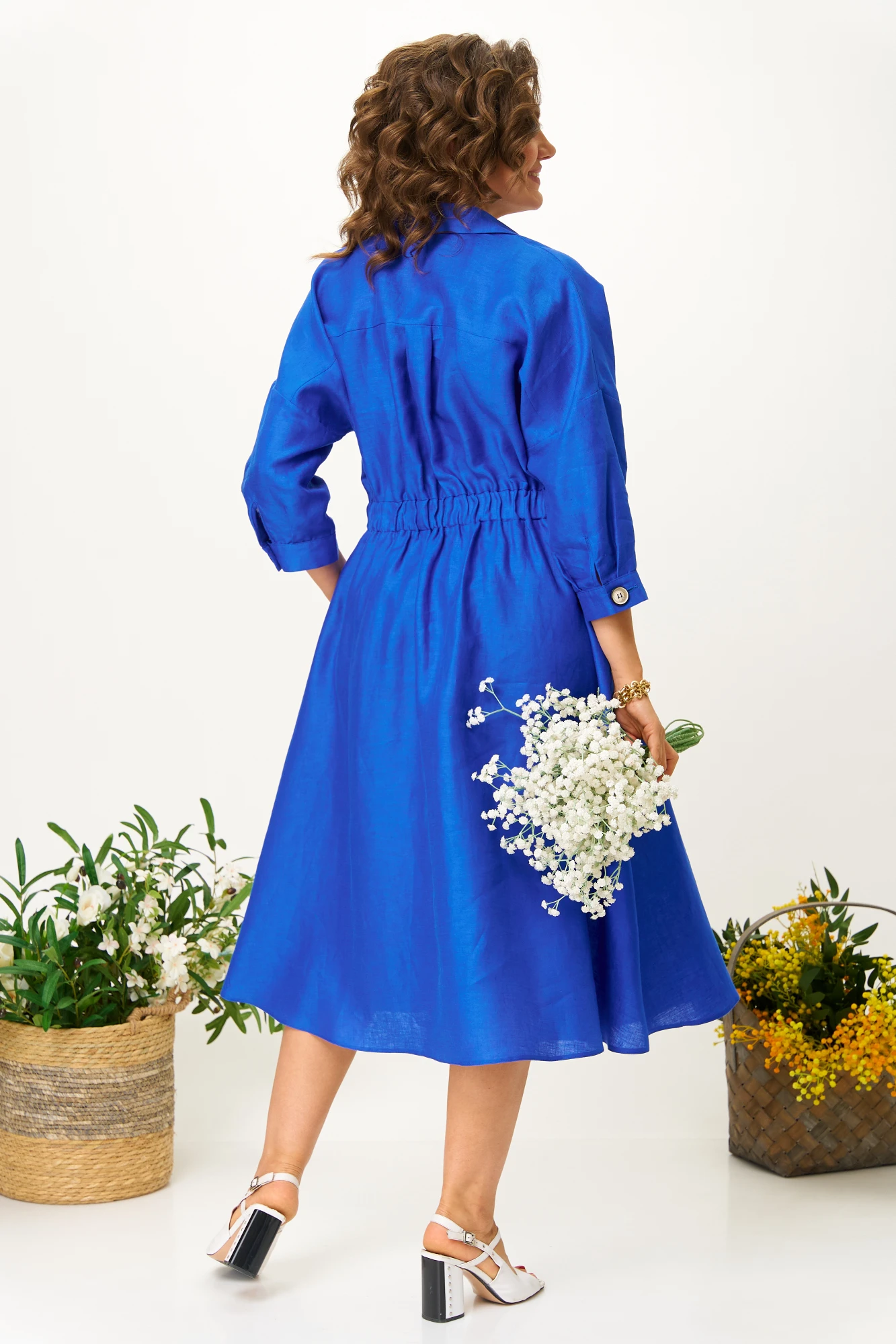 Элегантное женское палтье из натуральной ткани (премиальный лен) необычного кроя станет изюминкой вашего гардероба. Платье полуприлегающего силуэта, отрезное по линии талии со спущенным плечом. Рукав 3/4 длиный на отрезной манжете. По полочке идут защипы-складки в верхней и нижней частях, запах - на петли и пуговицы по подрезу. По нижней части платья запах идет в виде складки. По спинке кокетка со складкой, по подрезу вставлена резинка. Юбка-полусолнце с односторонними складками по полочке, по бокам карманы. По горловине воротник на отрезной стойке. Длина по спинке: 117см. Длина рукава с манжето 29см.
