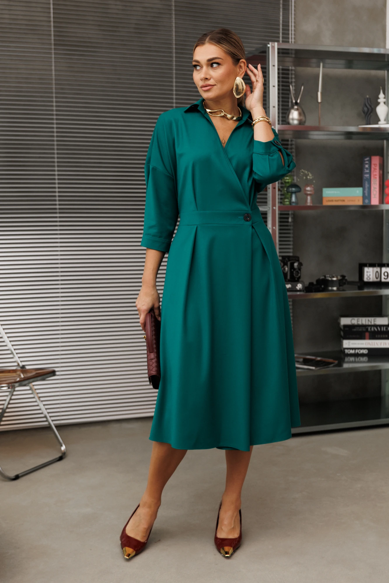 Элегантное женское палтье из костюмной ткани необычного кроя станет изюминкой вашего гардероба. Платье полуприлегающего силуэта, отрезное по линии талии со спущенным плечом. Рукав 3/4 длиный на отрезной манжете. По полочке идут защипы-складки в верхней и нижней частях, запах - на петли и пуговицы по подрезу. По нижней части платья запах идет в виде складки. По спинке кокетка со складкой, по подрезу вставлена резинка. Юбка-полусолнце с односторонними складками по полочке, по бокам карманы. По горловине воротник на отрезной стойке. Платье будет идеально смотреться с туфлями, ботинкаи и сапогами. Длина по спинке: 117см. Длина рукава с манжето 29см.