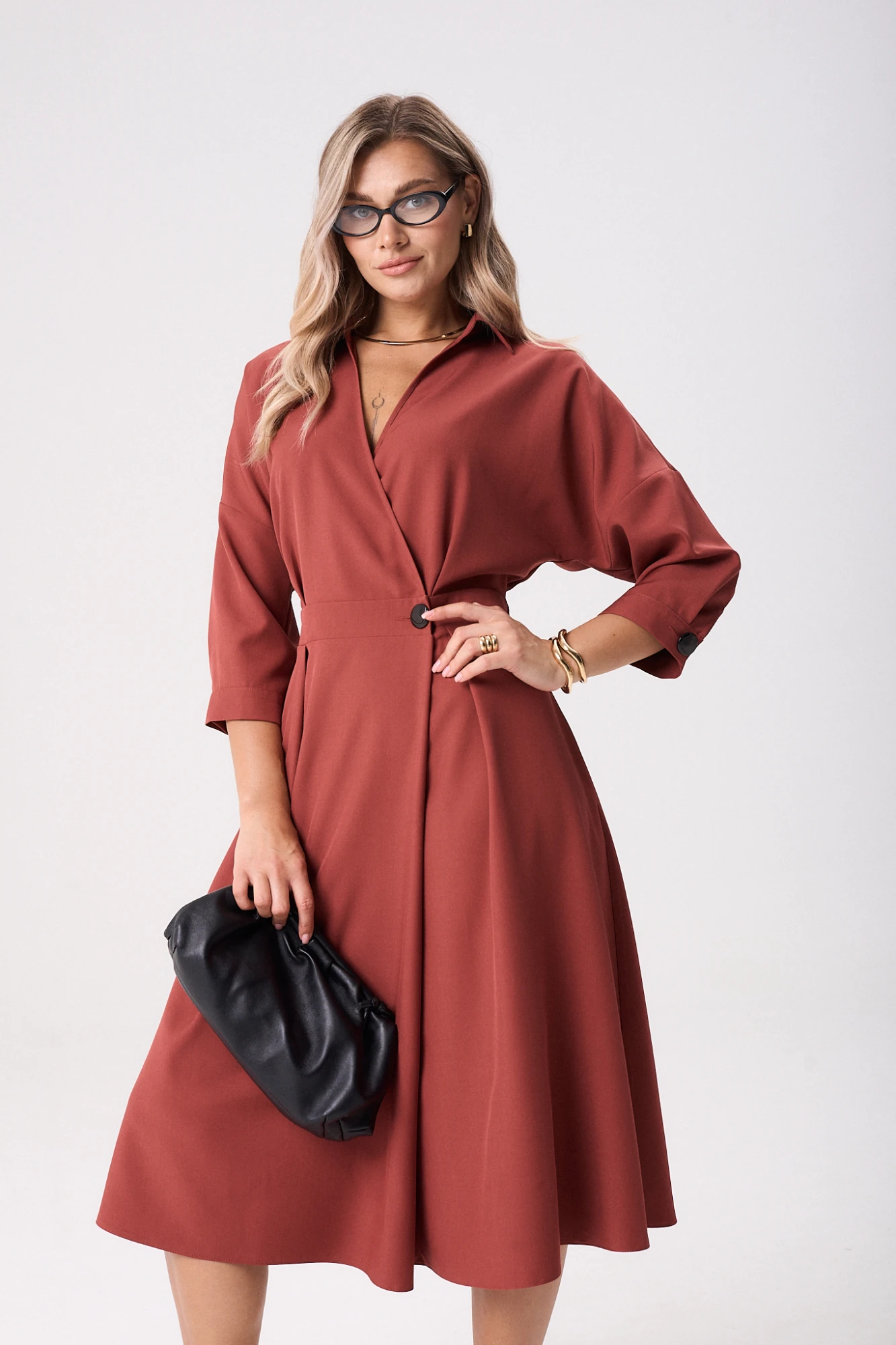 Элегантное женское палтье из костюмной ткани необычного кроя станет изюминкой вашего гардероба. Платье полуприлегающего силуэта, отрезное по линии талии со спущенным плечом. Рукав 3/4 длиный на отрезной манжете. По полочке идут защипы-складки в верхней и нижней частях, запах - на петли и пуговицы по подрезу. По нижней части платья запах идет в виде складки. По спинке кокетка со складкой, по подрезу вставлена резинка. Юбка-полусолнце с односторонними складками по полочке, по бокам карманы. По горловине воротник на отрезной стойке. Платье будет идеально смотреться с туфлями, ботинкаи и сапогами. Длина по спинке: 117см. Длина рукава с манжето 29см.