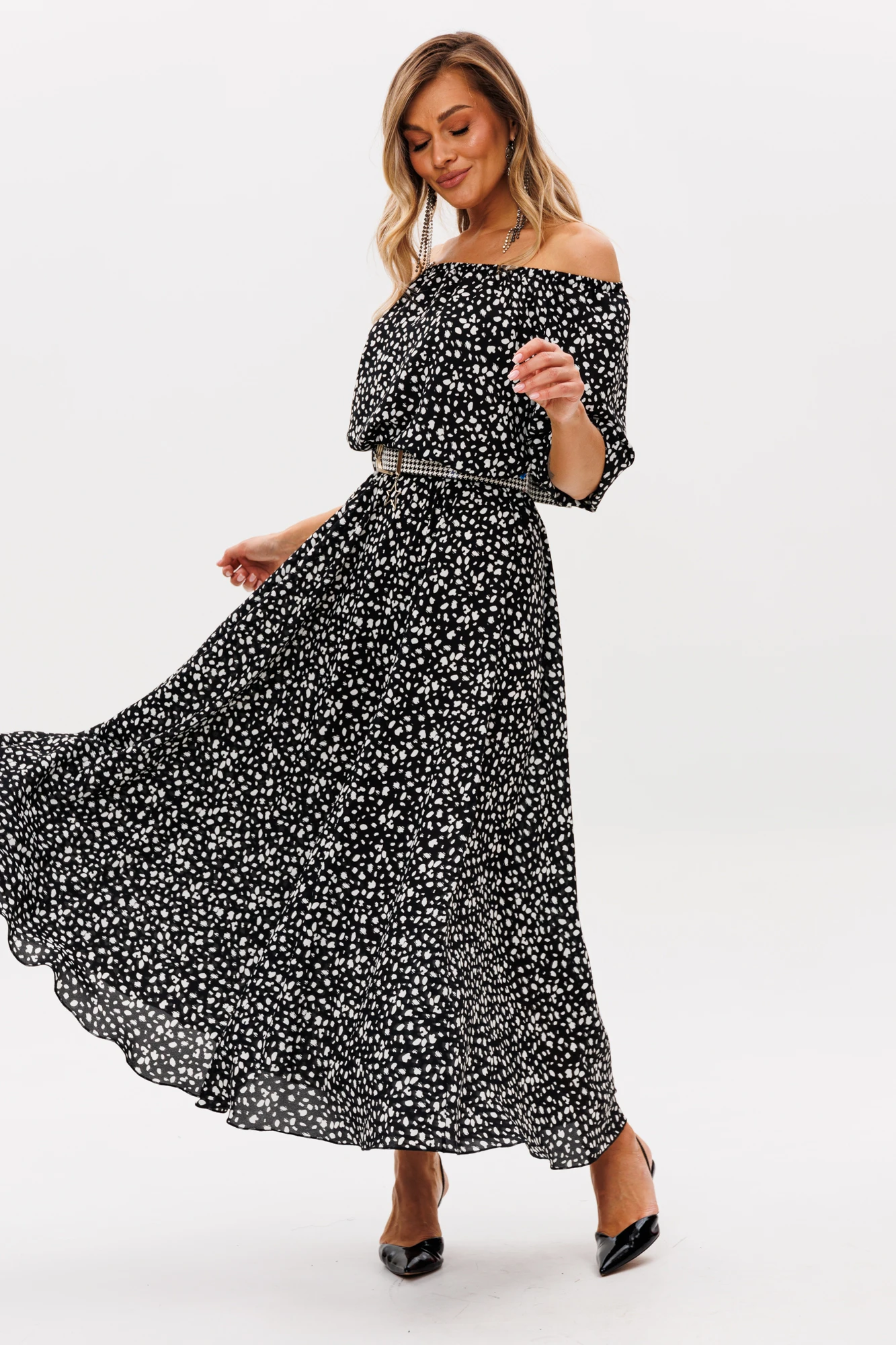 Платье макси свободного силуэта - лучший выбор на лета. Рукав реглан 3/4 длины, низ на резинке. Горловина собрана на резинку. Платье отрезное по линии талии, на резинке. Юбка полусолнце. В комплект входит съемный пояс.