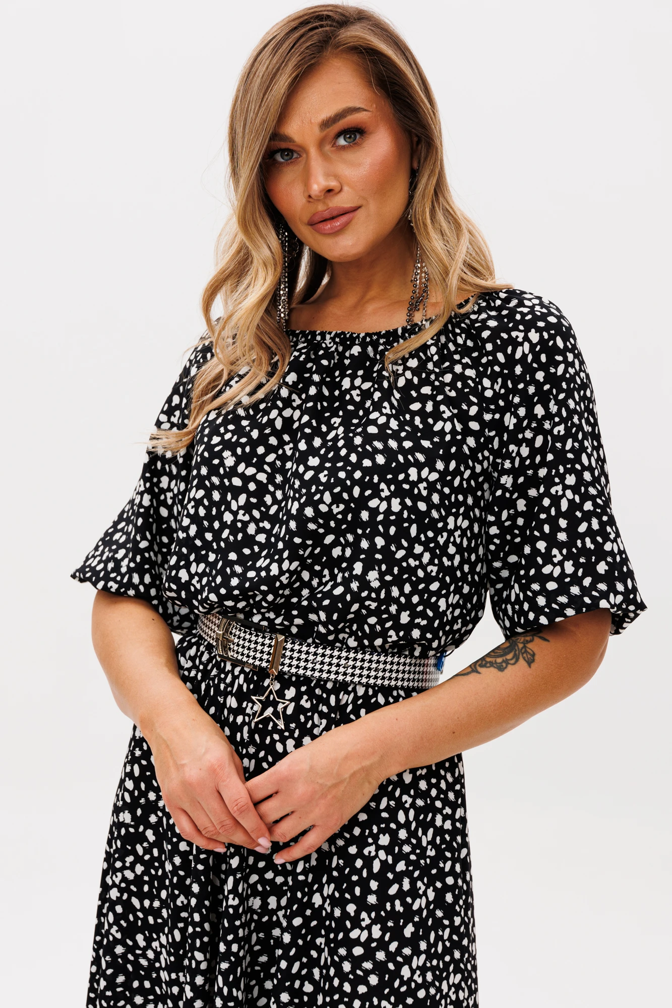 Платье макси свободного силуэта - лучший выбор на лета. Рукав реглан 3/4 длины, низ на резинке. Горловина собрана на резинку. Платье отрезное по линии талии, на резинке. Юбка полусолнце. В комплект входит съемный пояс.