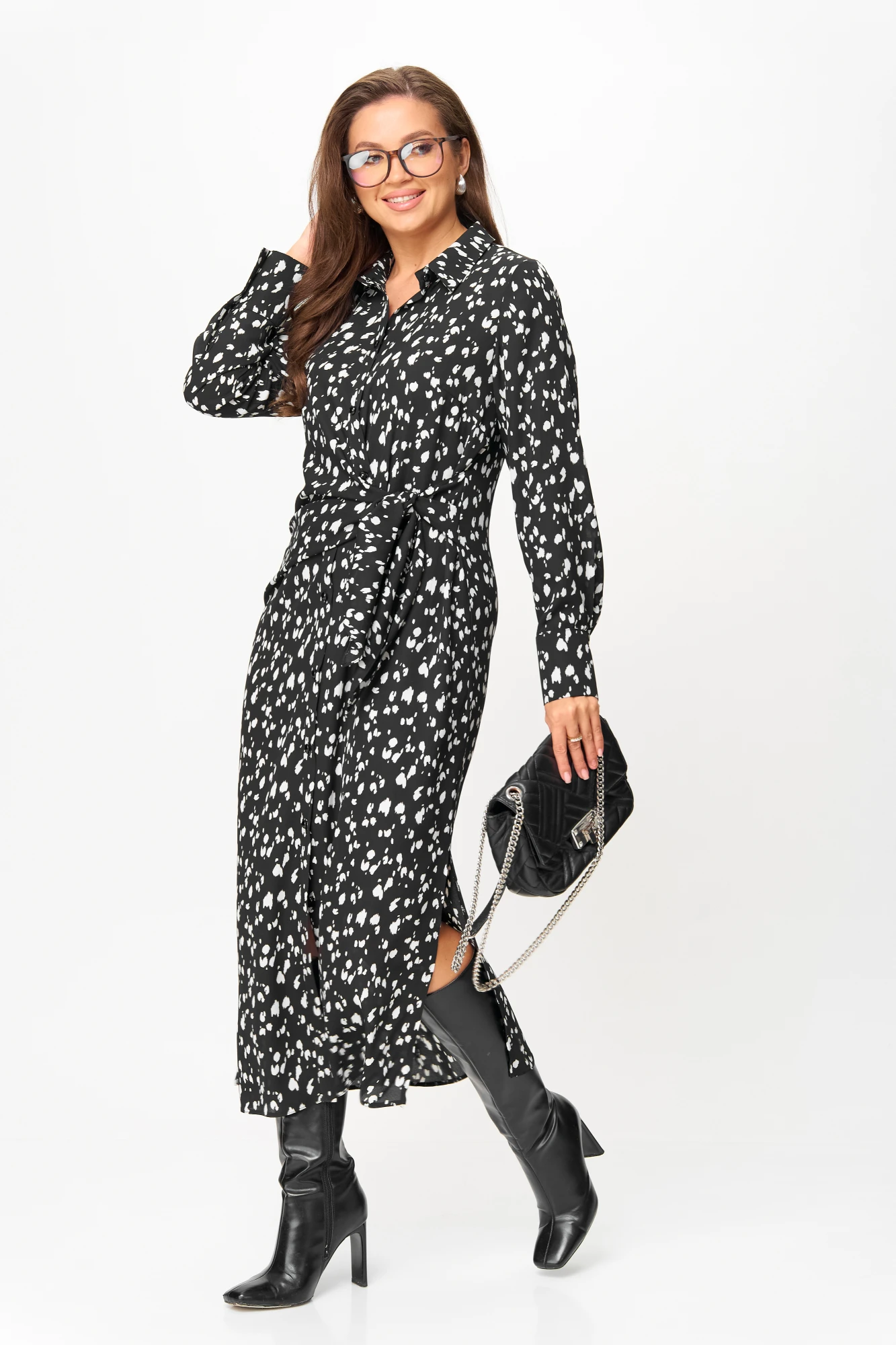 Платье рубашка от бренда «Анастасия» - создано для тех, кто ценит комфорт и элегантность. Платье оригинального кроя из блузочной ткани. Полочка ассиметричная: с одной стороны идет драпировка, переходящая в пояс, со второй стороны: пояс-завязка из бокового шва. Застежка -планка на петли и пуговицы. По бокам разрезы. Платье миди дополнено отложным воротником и длинными рукавами на манжете. Платье с пуговицами спереди подходит практически всем. Нарядное платье идеально для повседневной носки и стиля casual кэжуал. Повседневное платье рубашка - необычный вариант на каждый день, для прогулок, встреч в кафе и даже для работы, если позволяет дресс-код. Наряд надевают не только на повседневку, но и на фотосессию, на праздничные мероприятия – день рождения, новый год, новогодняя вечеринка. Модное платье с длинными рукавами можно комбинировать с разной обувью и одеждой для создания молодежных образов. Стильное платье идеально подойдет для повседневных выходов, особенно когда нужно добавить шарма и изящности в ваш образ. Оно также станет отличным выбором для особых случаев, таких как свадьба подруги, новогодний вечер или другие праздничные мероприятия. Универсальная длина миди и классический фасон рубашки делают его отличным выбором как для повседневного, так и для делового образа. Идеальное сочетание стиля и удобства для тех, кто ценит изысканность в каждой детали. Нам важно ваше мнение отзывы.. Длина по спинке (48-52)-127см, (54-58)-129см. Длина рукова с манжетой: (48-58)-65см.