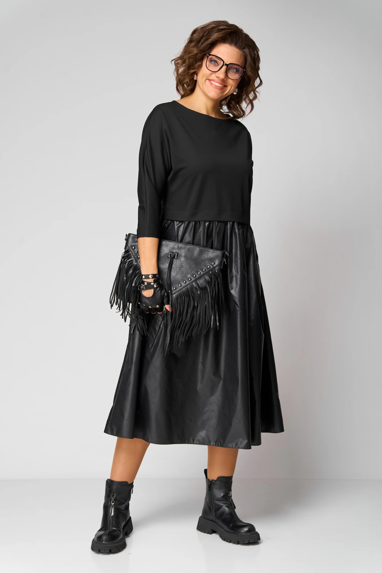 Создайте свой неповторимый образ с этим оригинальным женским платьем от Anastasia! Оно имеет удивительно комфортный крой, который скроет все недостатки фигуры. Идеальный вариант как для повседневной носки, так и для праздничного выхода, достаточно дополнить его соответствущими аксессуарами. Платье женское из двух видов ткани. Платье отрезное по линии талии со сборкой. Рукав 3/4 длины , "летучая мышь". По спинке - средний шов. Благодаря свободному крою платье отлично сядет на любую фигуру. Длина платья (по спинке):(48-52) 115см., (54-58)-120 см. Длина рукава от головины: (48-58)-55см.