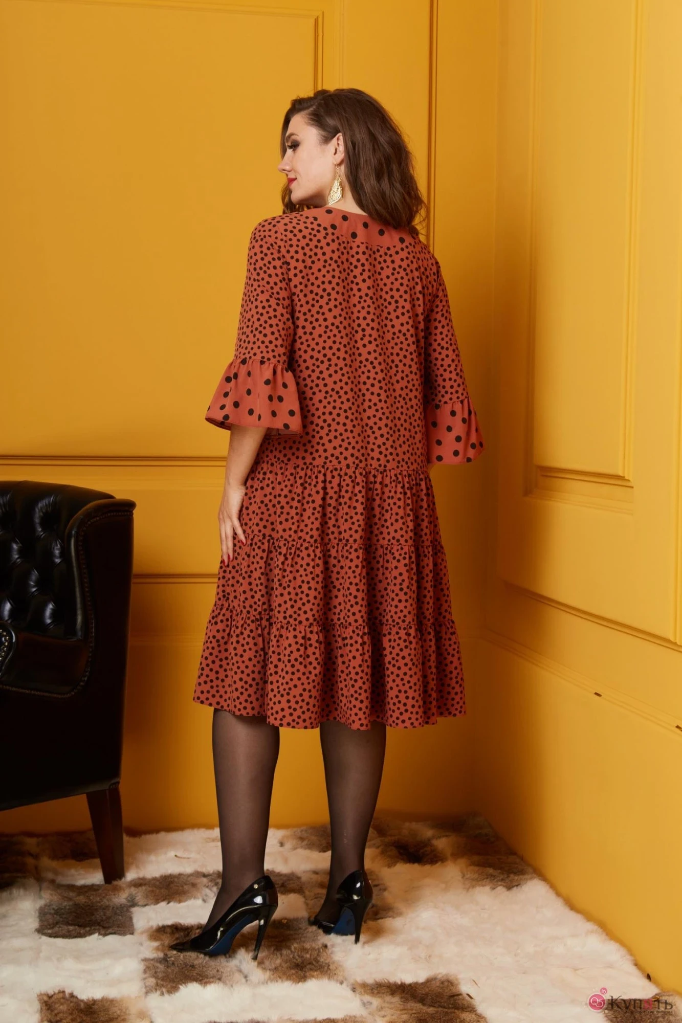 Платье женское, французский креповый шифон в мелкие и крупные горохи. Платье- пышное, прямого силуэта, средней длины . Лиф переда и спинки платья- цельные. По юбке ниже талии -три ряда собранных в сборку воланов. В горловину вставлена вставка по переду V- образной формы, по спинке - овальной , обтачана обтачкой. Рукав одношовный, втачной, 3/4 длины. По низу рукава -широкая рюша.