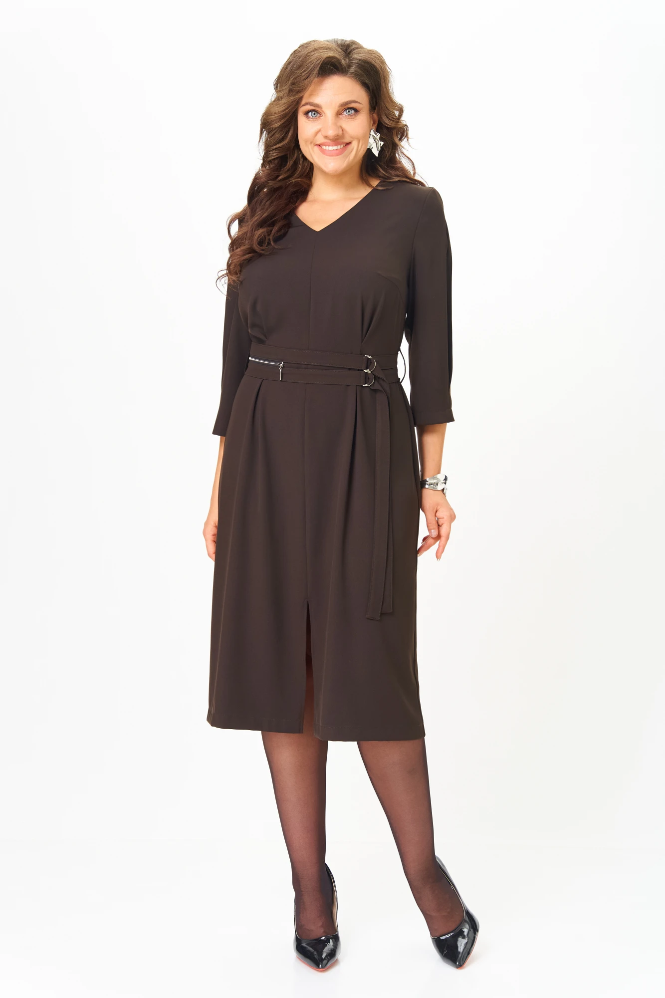 Элегантное и стильное платье от бренда Anastasia Mak идеальный выбор для современной женщины, которая ценит комфорт и стиль. Платье прекрасно подойдет на каждый день, в офис, для праздника или вечеринки. Платье прямого силуэта, длиной за колено, выполнено из однотонной ткани. Полочка платья с центральным швом и нагрудными вытачками, В области талии обработаны складки-защипы, в нижней части среднего шва разрез. Горловина V-образной формы. Спинка со средним швом, в верхней части которого обработана потайная молния. По боковым швам в области талии настрочены шлевки через которые продет пояс с декоративным элементом в виде молнии и застежки на полукольца. Рукав длиной ¾, втачной, с бантовой складкой по верхней части рукава