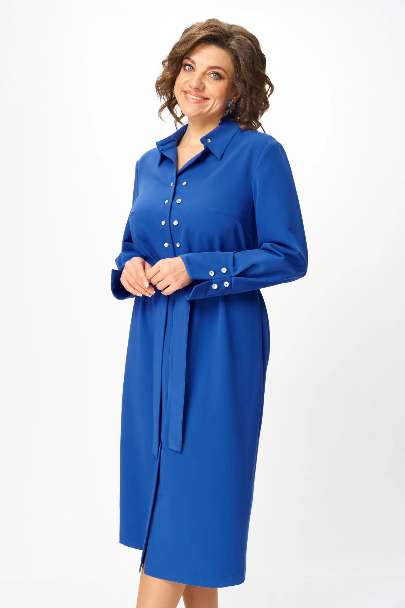 Полочка платья с центральным швом, в верхней части которого выполнена оригинальная застежка на петли и пуговицы, в нижней части центрального шва полочки обработана шлица. Полочка с нагрудными вытачками. Горловина круглой формы с воротником рубашечного типа. Спинка со средним швом. Рукав втачной, одношовный, длинный, по низу со складкой и притачной манжетой. Манжета с разрезом по низу и декором из пуговиц.