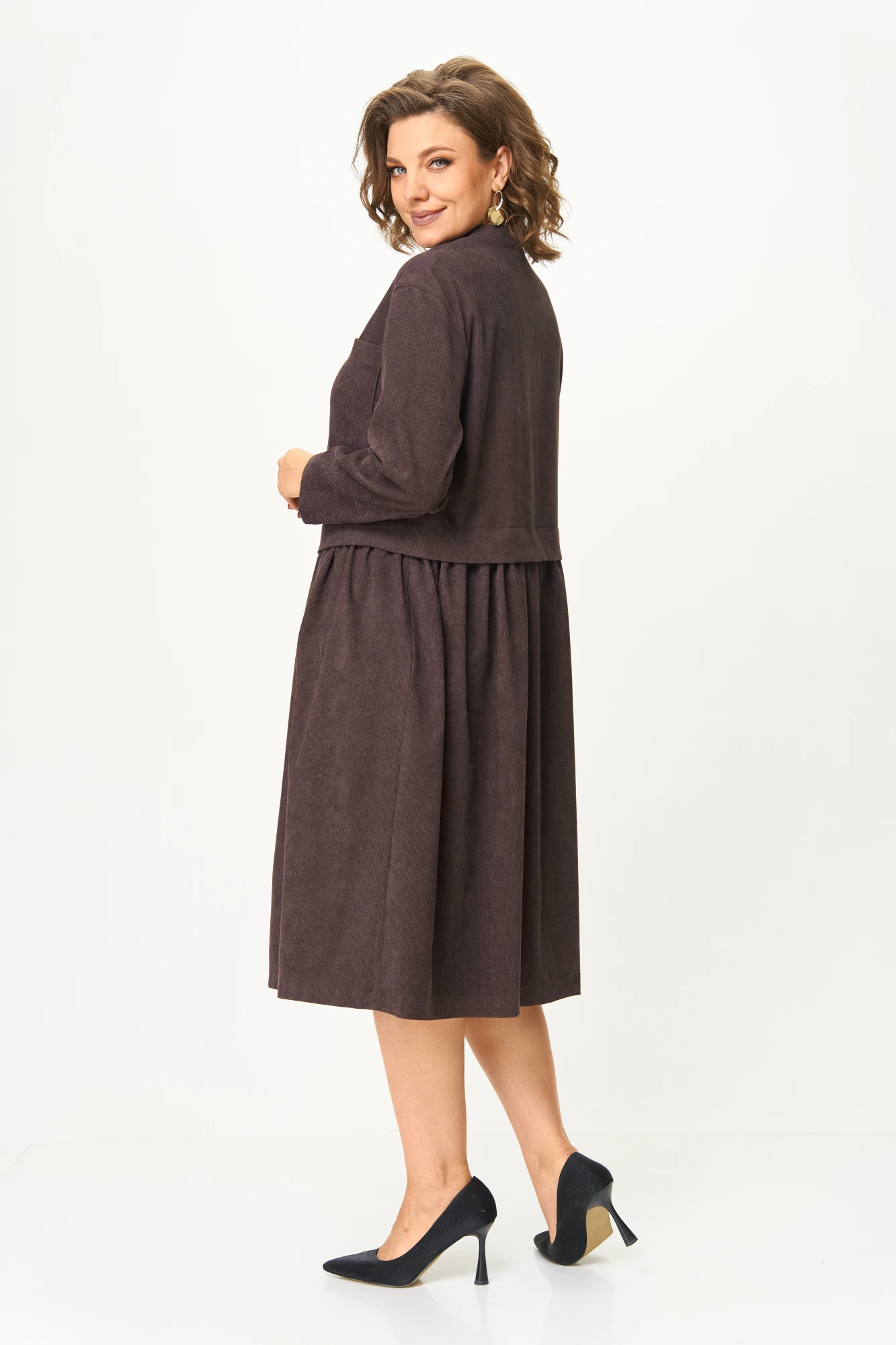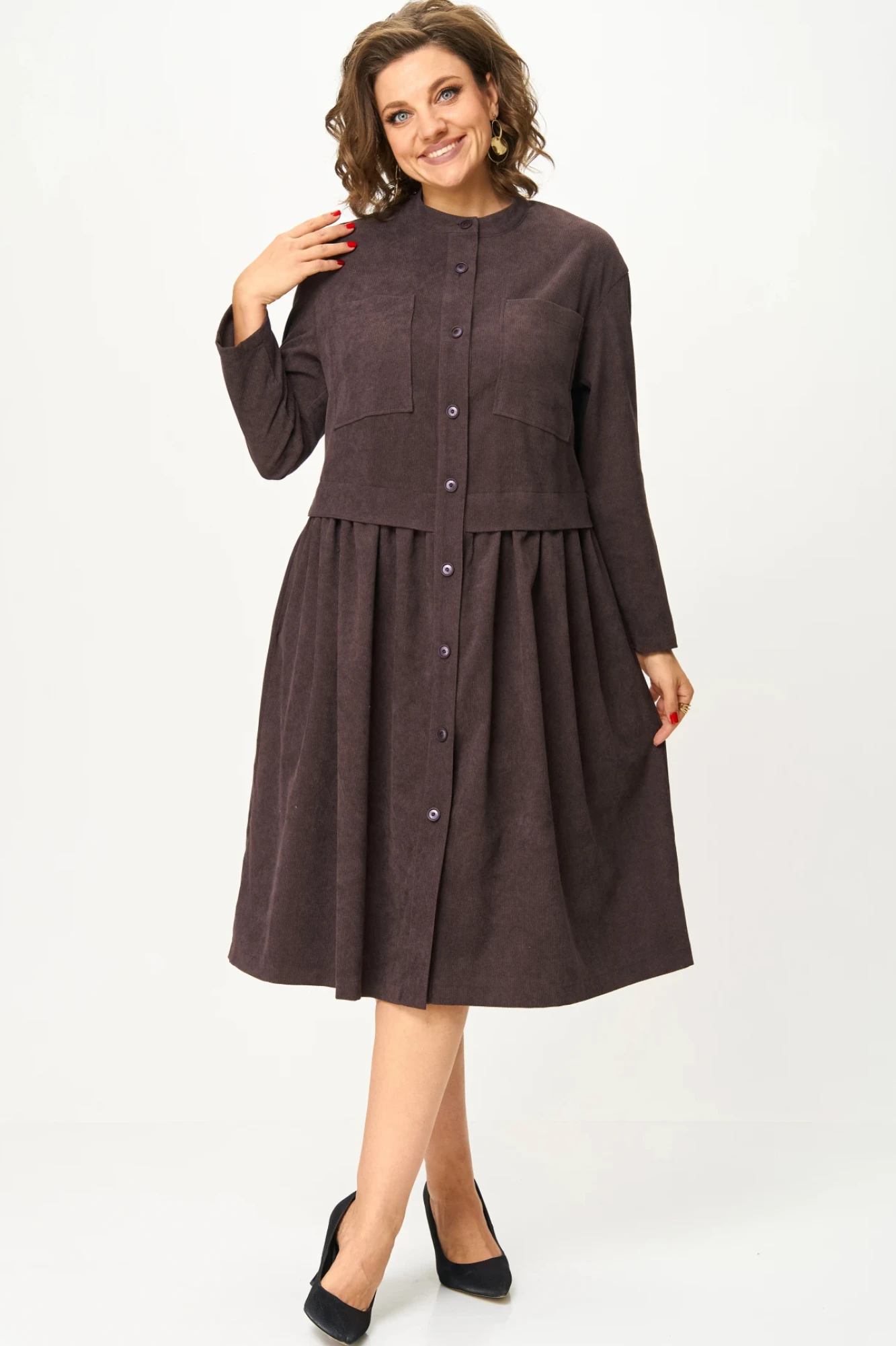 Платье прямого силуэта, длиной за колено, выполнено из вельвета в мелкий рубчик. Полочка платья с отрезной планкой по центру и застежкой на петли и пуговицы. Лиф платья отрезной , со складкой по низу, к срезу которой притачана юбка со сборкой. Полочка лифа с нагрудными вытачками и накладными карманами. Горловина круглой формы обработана воротником-стойкой. Пройма углубленной формы с рукавом рубашечного типа, рукав длинный, одношовный. В боковых швах юбки обработаны карманы.