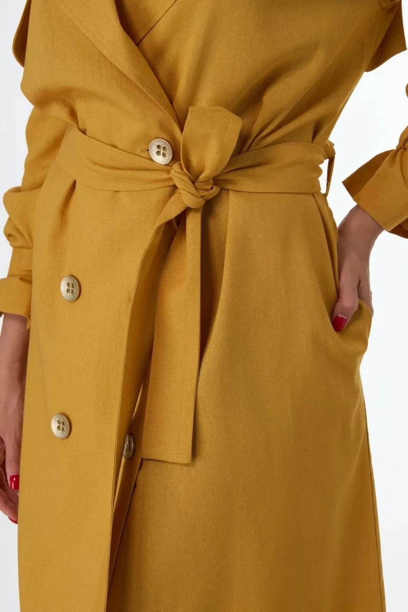 Платье-тренч выполнено из льняной ткани в оттенках сезона: насыщенный желтый (янтарные тона), классический чёрный и разбавленный фиолет.