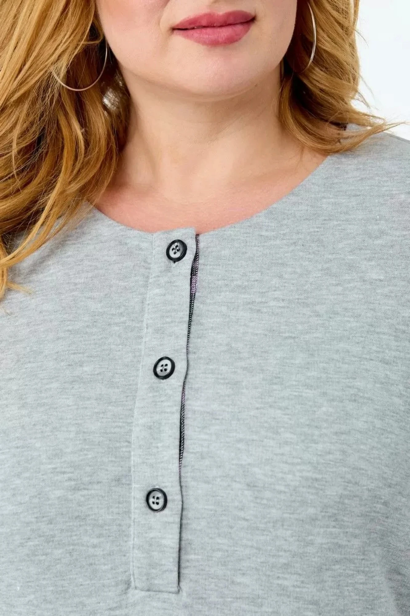 Цельнокроеные укорочённые рукава,округлый вырез горловины с застёжкой на пуговицы.