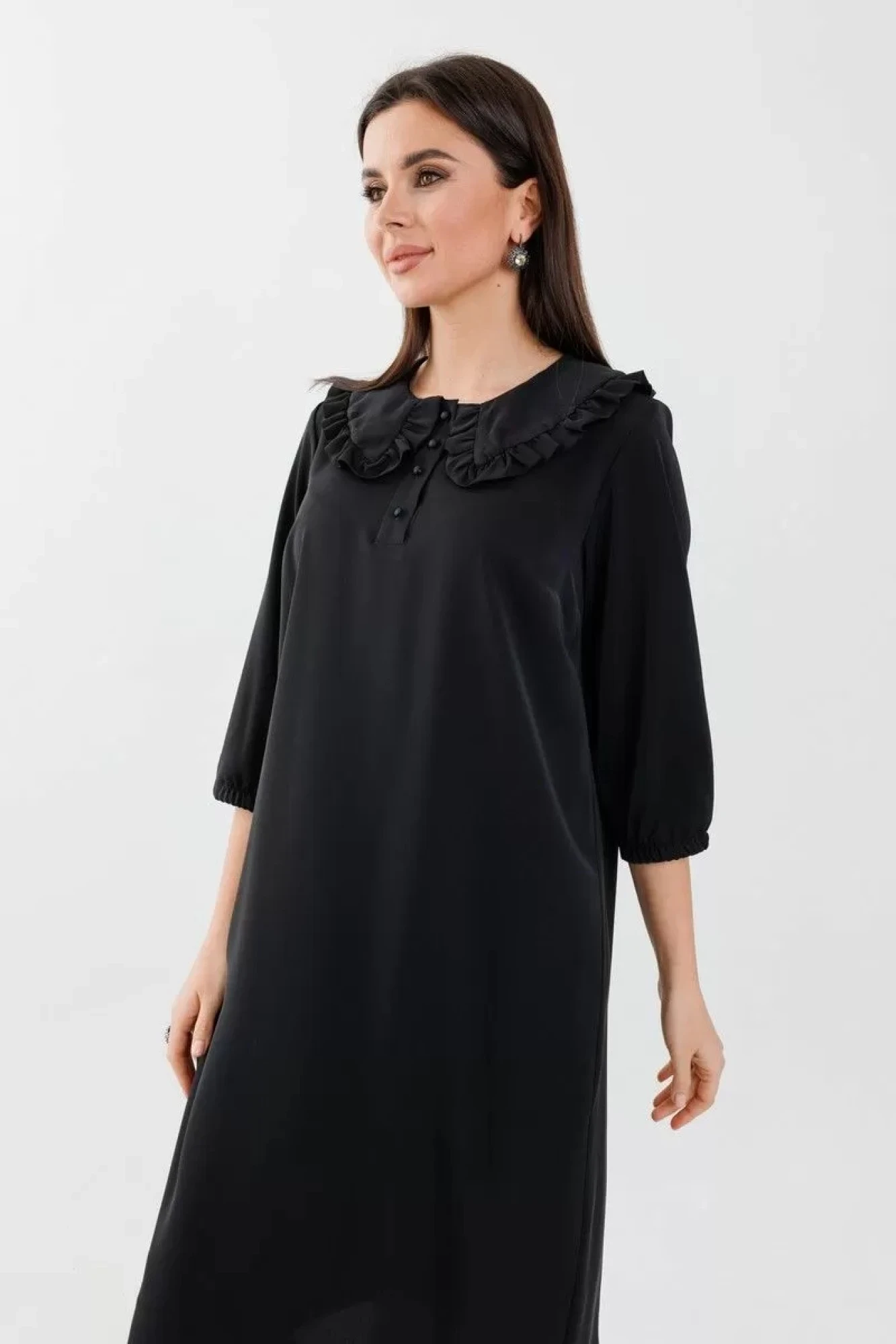 Платье женское, прямого силуэта, чуть расширенное к низу, длина за колено. Рукав втачной, длина 3/4, низ на резинке. По переду нагрудные вытачки и застежка на петли пуговицы до талии. Горловина обработана отложным воротником с рюшей. Дополнительно талию можно подчеркнуть при помощи съемного пояса. Стильное, женственное и многофункциональное платье станет отличным дополнением вашего образа.