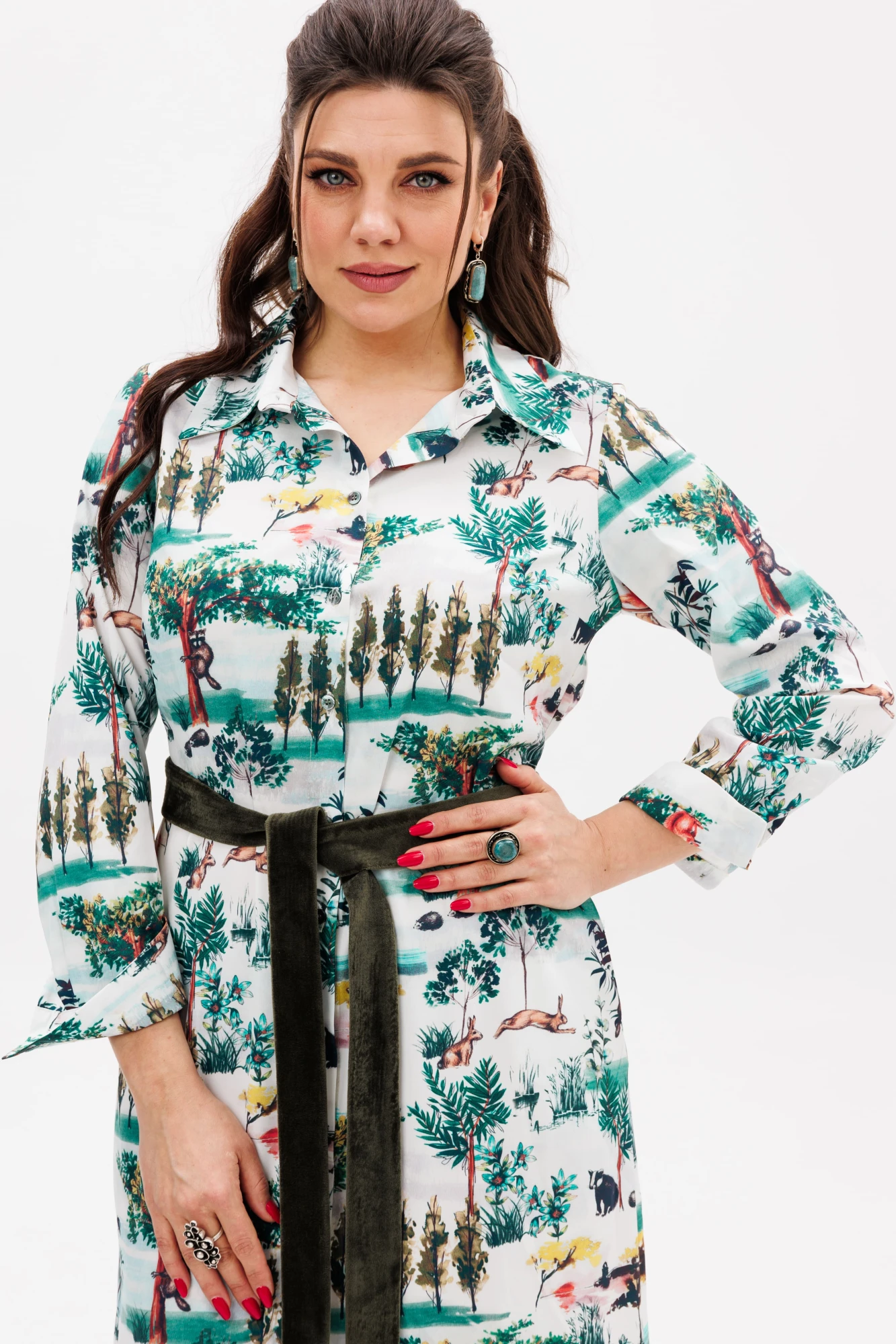 Особый шарм платью придаёт съёмный пояс с кисточками, подчёркивающий талию и добавляющий нотку игривости. А принт «лесное царство» оживляет образ, наполняя его природной теплотой и романтикой.