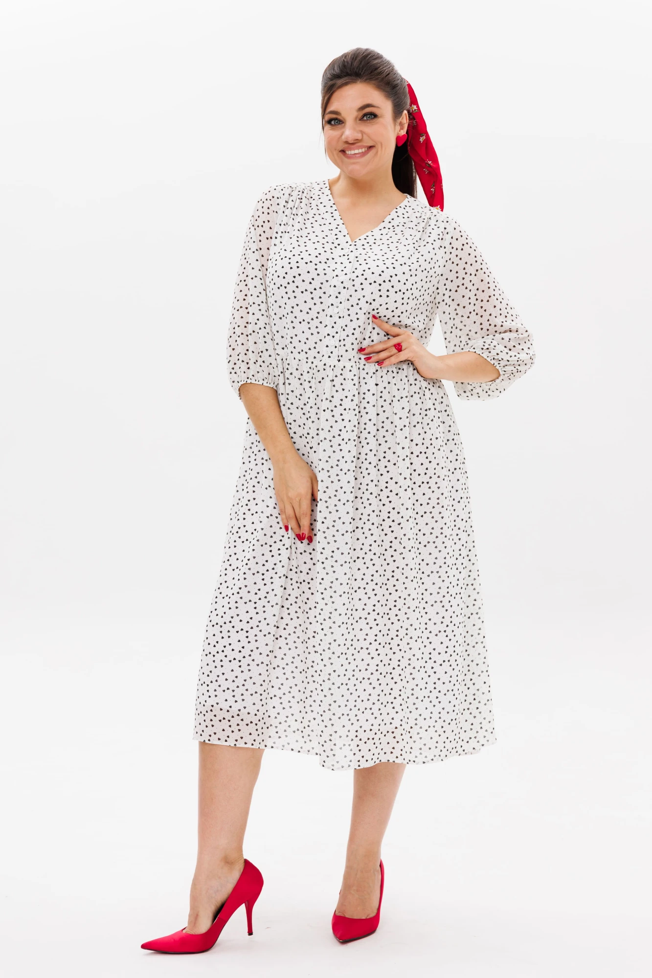 Рукава 3/4 с резинкой по низу создают легкость и игривость, а отрезное по талии с аккуратной сборкой обеспечивает идеальную посадку. Платье также имеет съемный чехол ,который обеспечивает комфорт и уверенность во время носки. Вы можете быть уверены, что ваше платье будет выглядеть безупречно и элегантно.