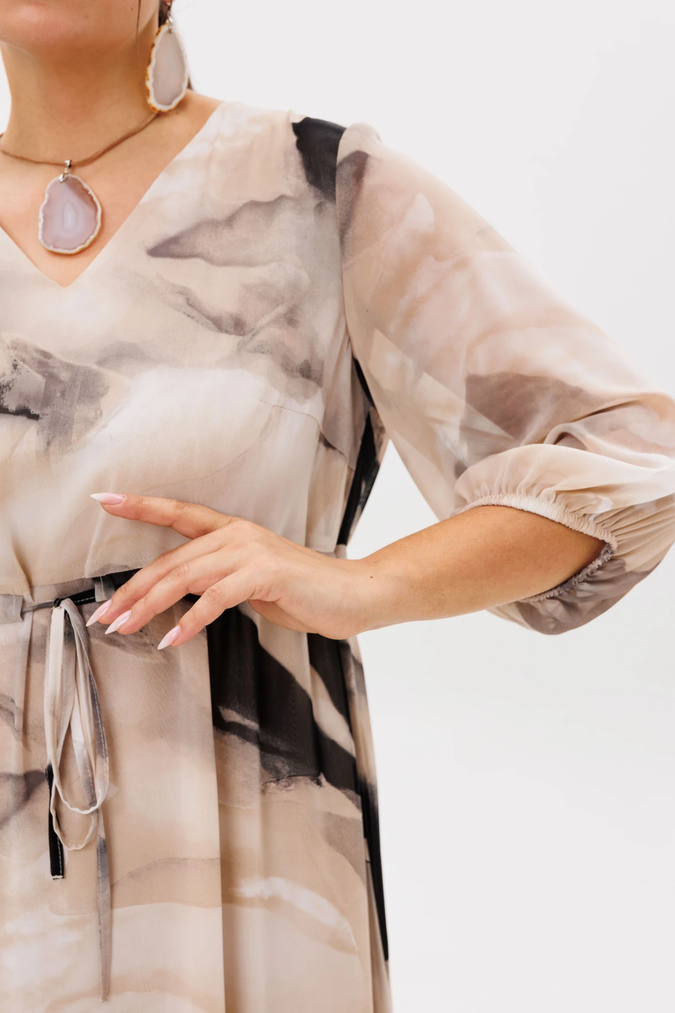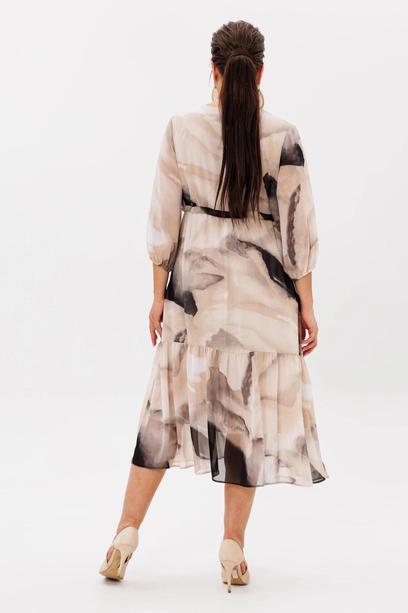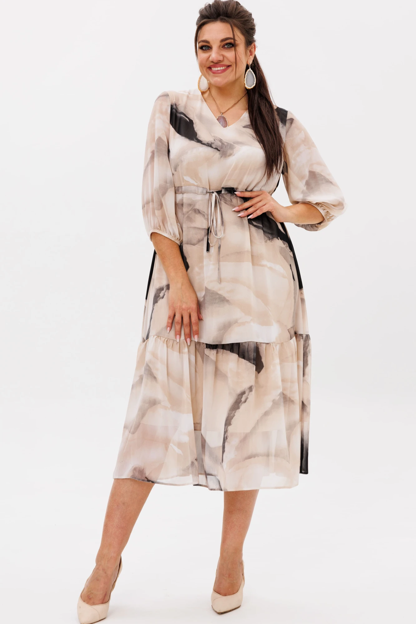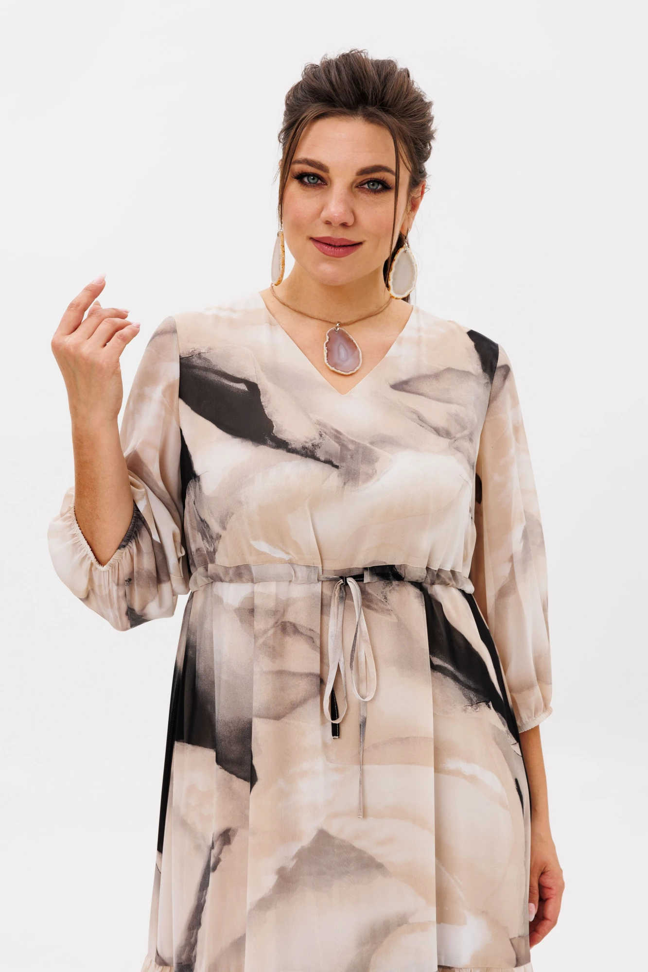 Погрузитесь в мир элегантности и утонченности с этим потрясающим платьем А-силуэта. Его изысканный V-образный вырез нежно обрамляет шею, придавая образу особую грацию и шарм. Рукава длиной 3/4, выполненные с легким расширением к низу, добавляют воздушности и романтики, а резинка на рукавах обеспечивает комфорт и свободу движений.