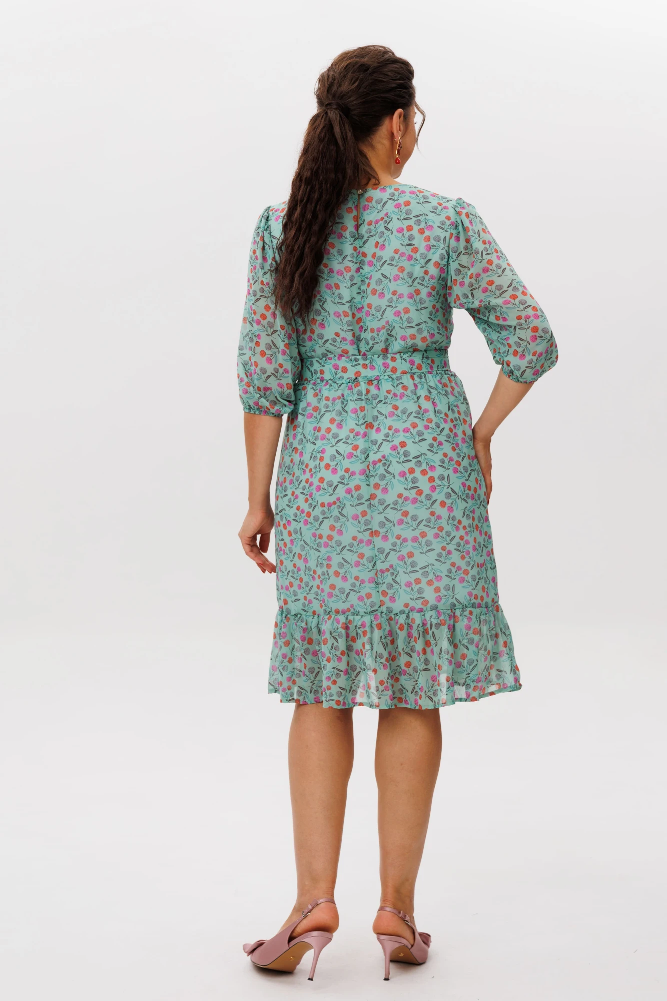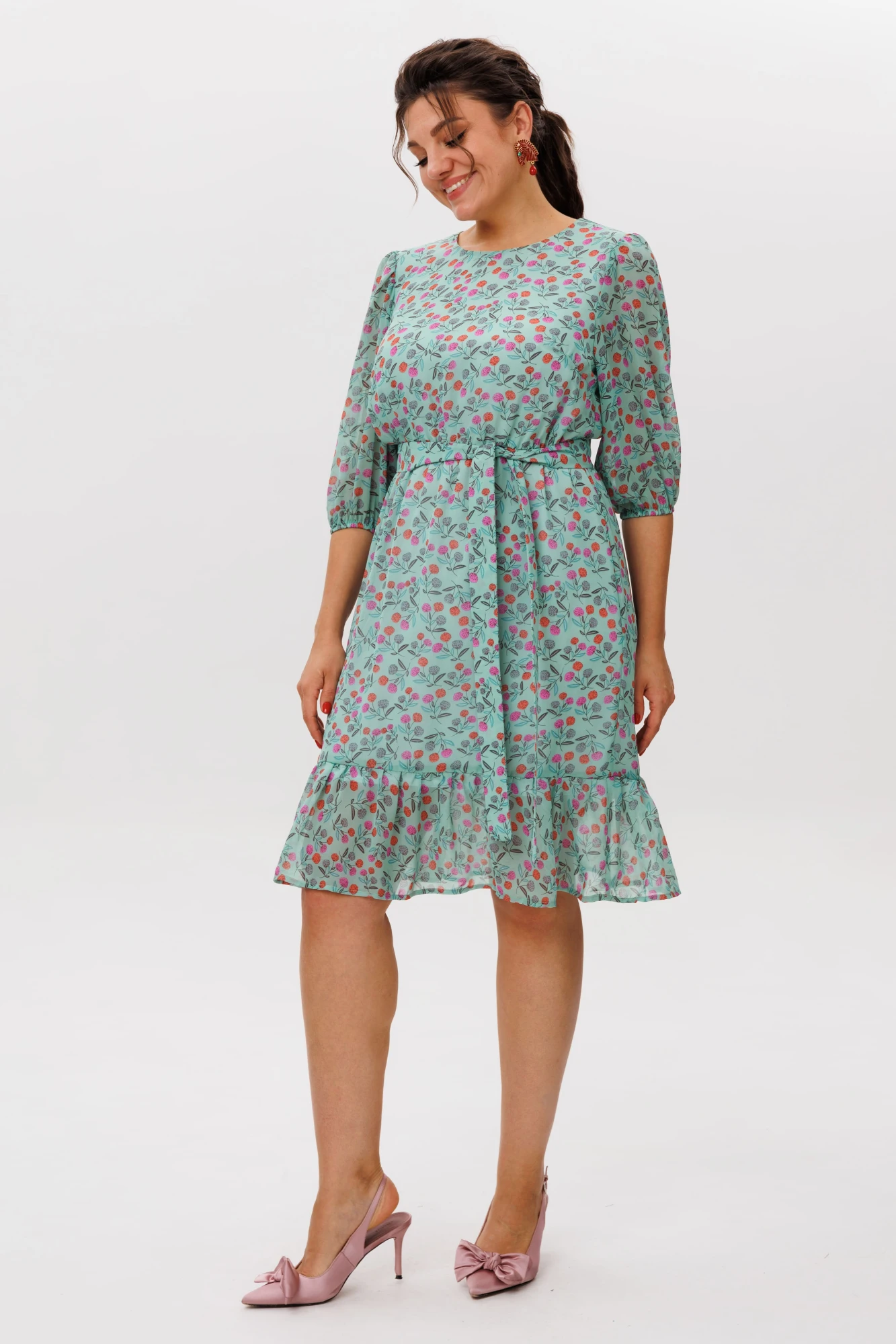 Это платье «мятная феерия» — воплощение элегантности и романтики. Сшитое из лёгкого шифона с нежным цветочным принтом, оно создаёт воздушный и женственный образ. Прямой крой с изящным воланом по подолу придаёт силуэту мягкую динамику, а резинка по талии подчёркивает фигуру, сохраняя удобство.