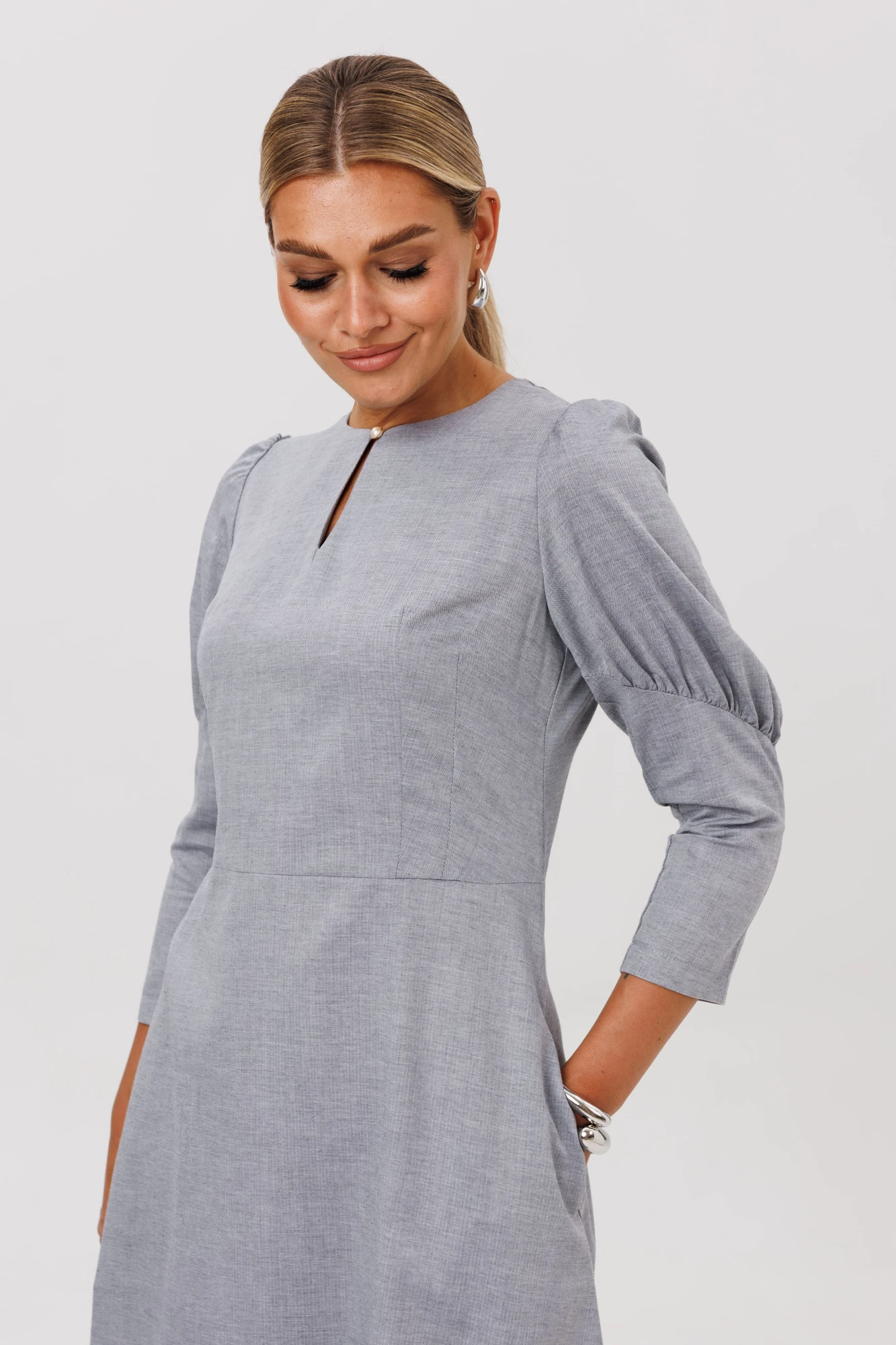 Застежка-капля по центру переда с навесной петлей придает платью особый шарм, в то время как потайная молния на спинке обеспечивает идеальную посадку по фигуре. Это по-настоящему красивое и универсальное платье, которое станет изысканным выбором для любого дня.