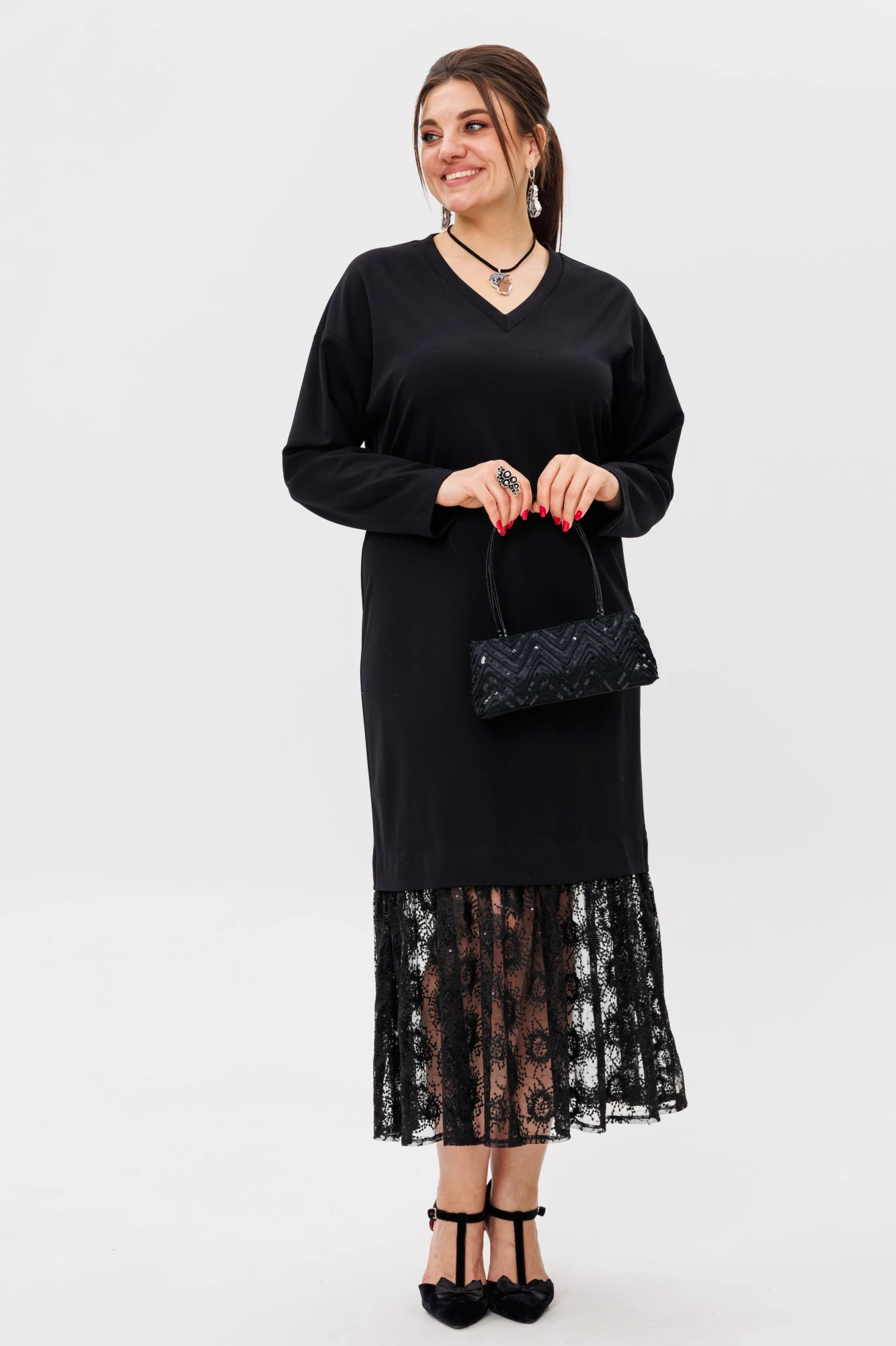 Изысканный дизайн сочетает в себе сдержанную мягкость и легкость в виде отделки низа юбки гипюром, добавляя нотку игривости и романтики, делая платье особенно привлекательным.