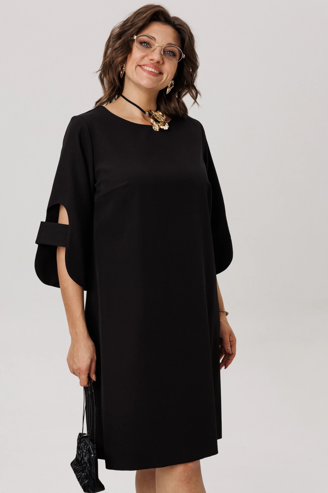 Платье от Анелли, воплотившее в себе торжественную элегантность, построено на безупречном крое и продуманных деталях. Его силуэт-трапеция, ниспадающий до длины, слегка прикрывающей колено, создает современный и уверенный образ.