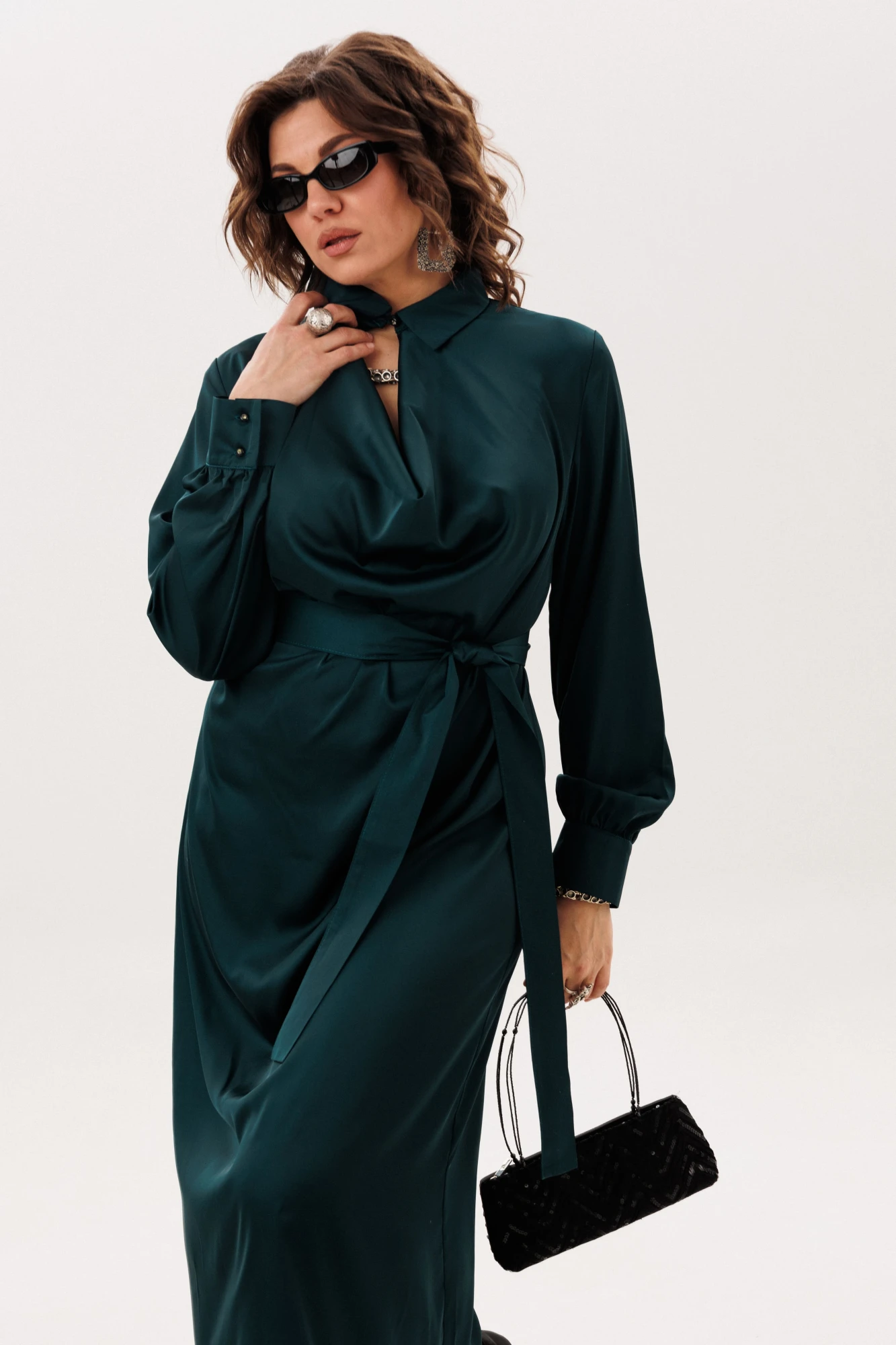 Платье от Анелли из струящегося армани шелка в цвете «глубоководный зеленый» обретает благородную мягкость в полуприлегающем силуэте, который чутко следует за линией тела.