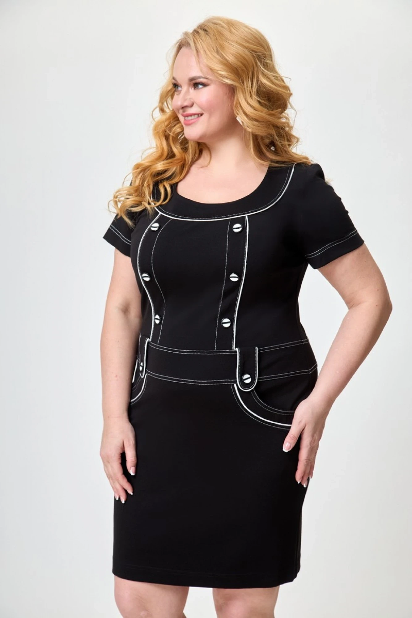Платье женское приталенного силуэта, длиной до колена. По переду рельефы с декором, отделочная контрастная строчка и пуговицы, карманы (декоративные или функциональные? Образца нет у меня, я не знаю, если у вас есть посмотрите и допишите) Рукав втачной короткий. Платье универсальный вариант для работы/учебы, отлично будет смотреться, как с жакетом, так и с лёгкий пальто/тренчем.