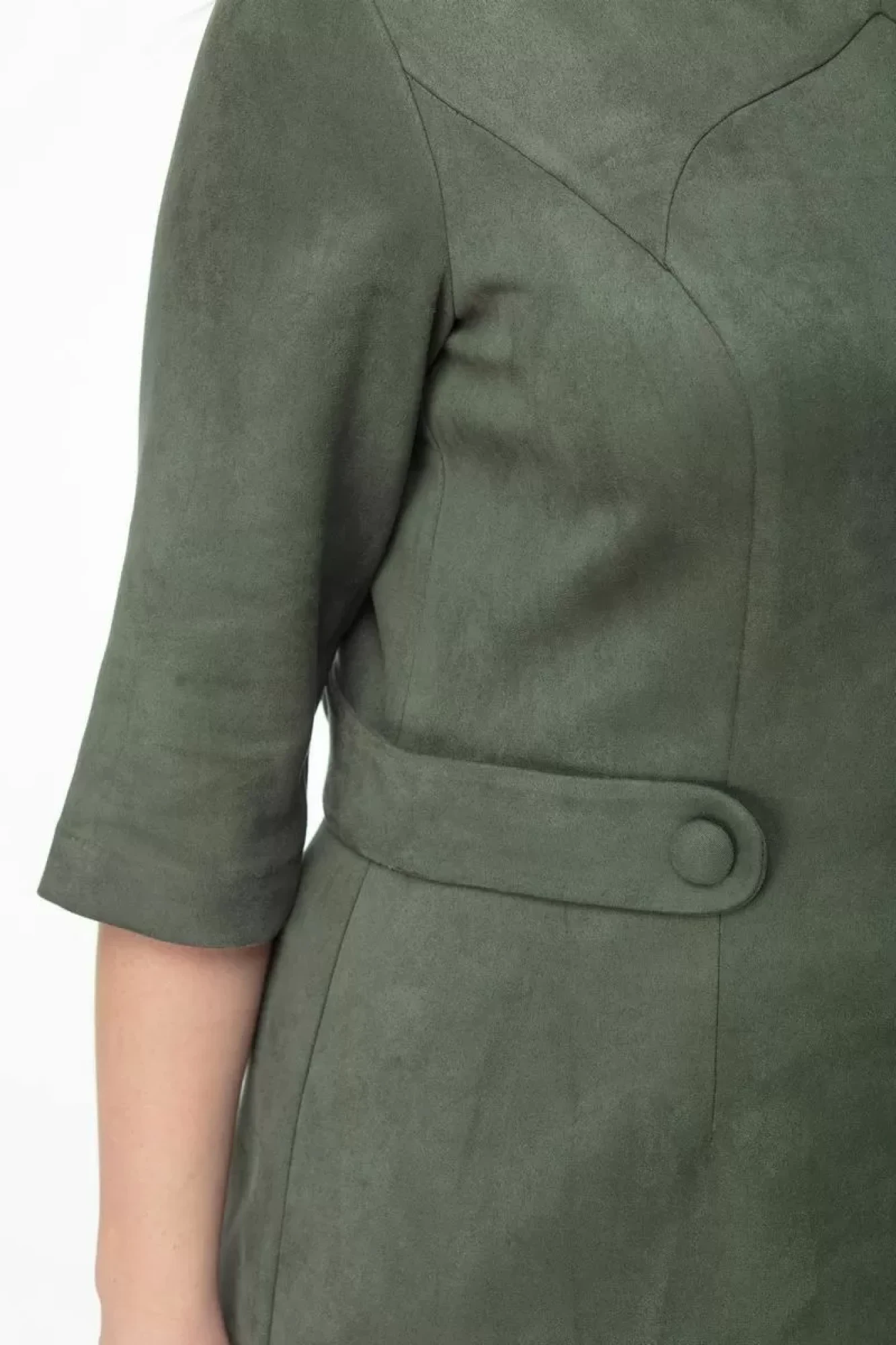 Линии рельефа переходят в выточку на талии. Линия талии подчеркнута патами с яркими пуговицами. Силуэт: Прилегающий