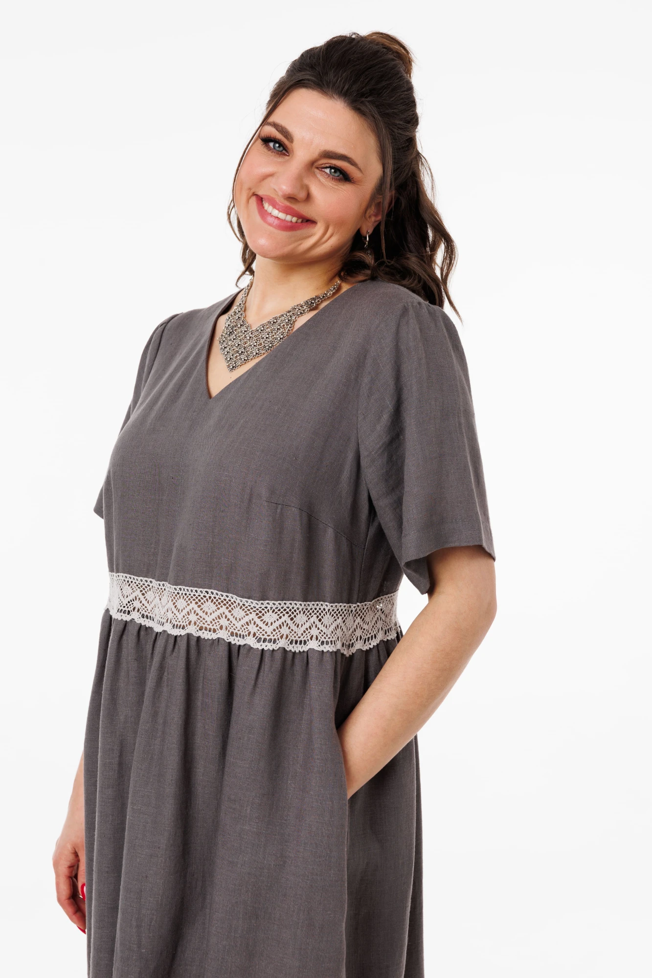 Это платье в цвете «пепельное кружево» — воплощение элегантной сдержанности. Мягкий пепельный оттенок льняной ткани придает образу благородную глубину, а тонкое белое кружево добавляет ноту женственности, не перегружая его.