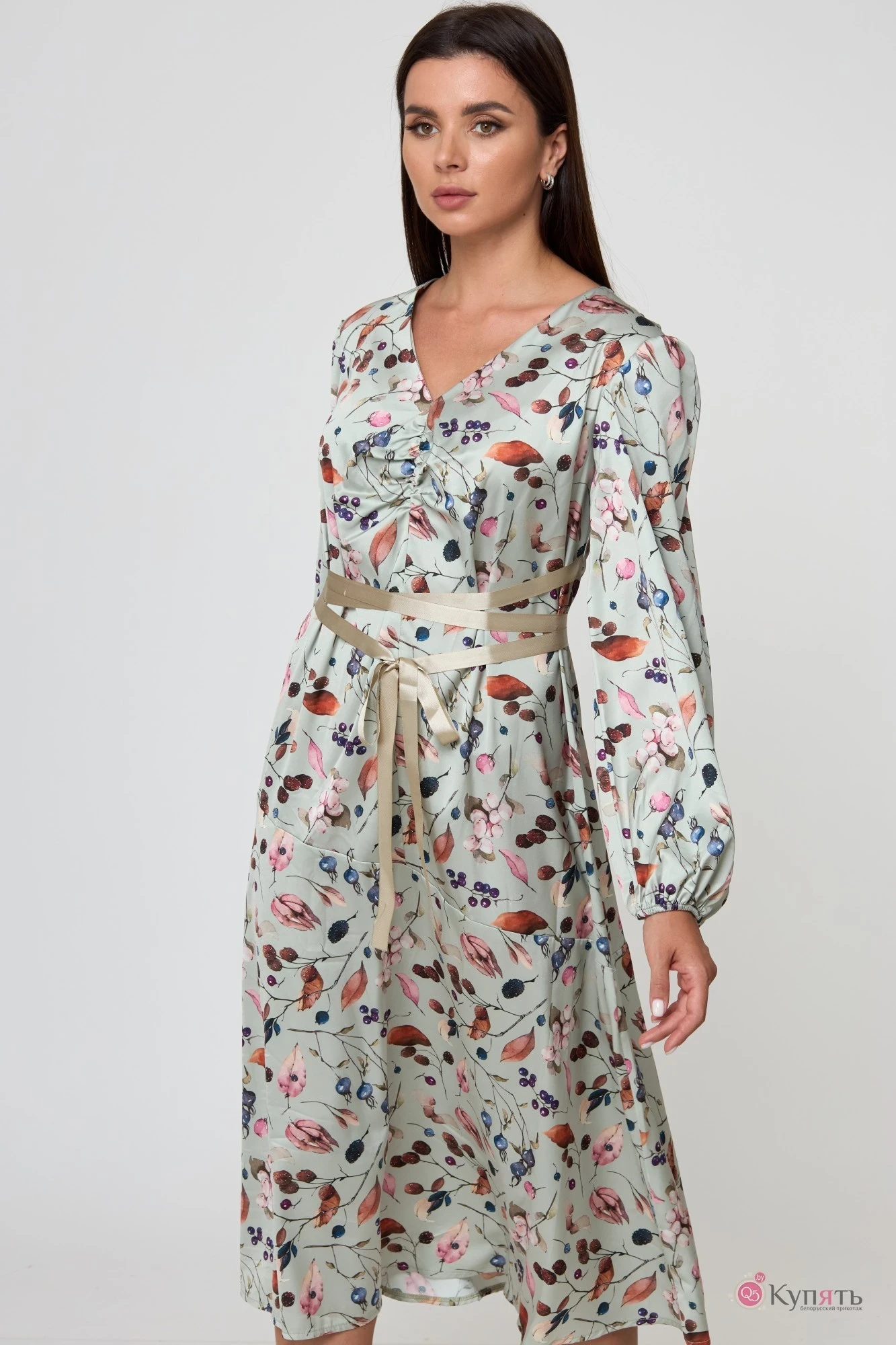 Полуприлегающий силуэт. Отрезное с V-образным вырезом горловины. Рукав на резинке внизу. Платье с объемной юбкой и поясом. Застежка потайная молния в среднем шве спинки. Рукава на резинке.