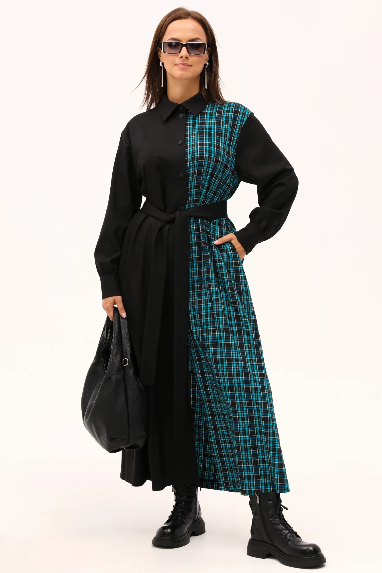 Платье А-силуэта длиной макси. Воротник рубашечного типа - отложной на отрезной стойке. Блузка прямого силуэта. Воротник рубашечного типа - отложной на отрезной стойке. По переду расположена центральная застежка на кнопки. Спинка со средним швом. В боковых швах обработаны функциональные карманы. Рукав втачной прямой длинный, со спущенной линией плеча, по низу на манжете с застежкой на кнопки. Сделать силуэт более приталенным и выгодно подчеркнуть достоинства Вашей фигуры поможет пояс, идущий в комплекте."